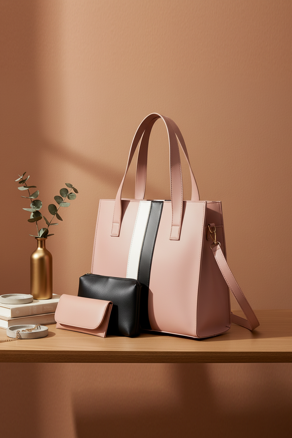This elegant 3-in-1 bag set includes a spacious blush pink tote bag with a bold black and white vertical stripe design, paired with a sleek black zippered pouch and a matching blush pink wallet. Crafted from premium PU leather, the tote features sturdy top handles and a detachable shoulder strap for versatile carrying options. Perfect for work, shopping, or casual outings, this stylish set combines practicality with a modern, feminine touch.