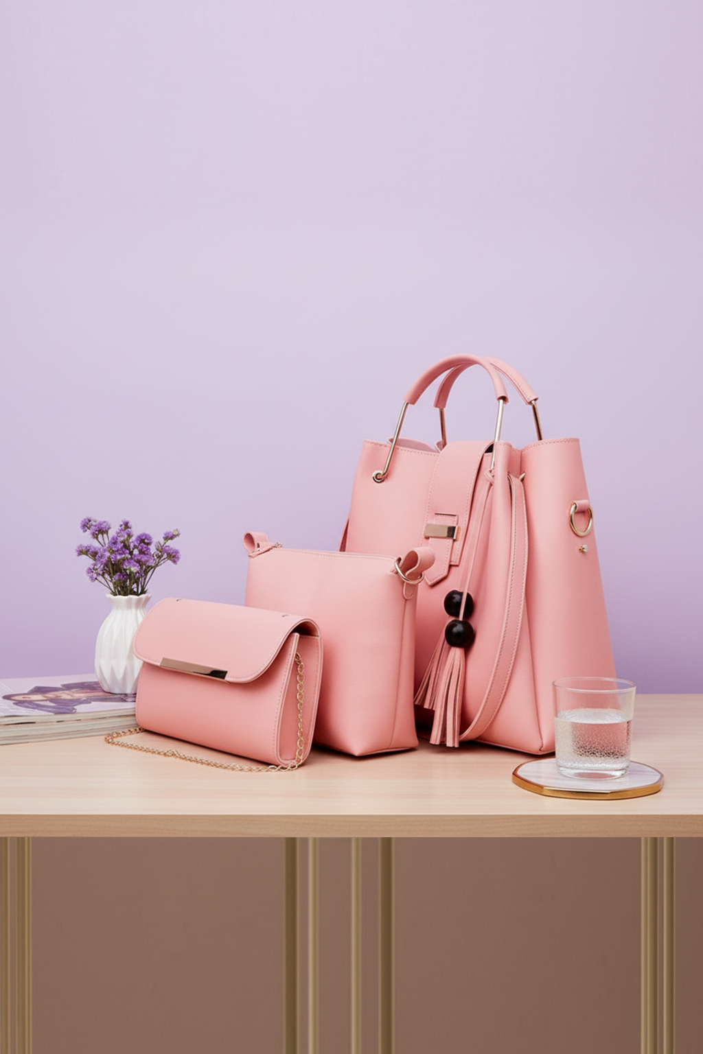 This blush pink 3-piece handbag set is a stylish and versatile choice for every occasion. The set includes a spacious tote with chic tassel details, a medium-sized shoulder bag, and a sleek clutch with a gold chain strap. Designed with a modern minimalist aesthetic, each piece combines functionality with elegance, making it perfect for work, casual outings, or evening events. The soft blush pink tone adds a feminine charm, while the structured design ensures durability and style.