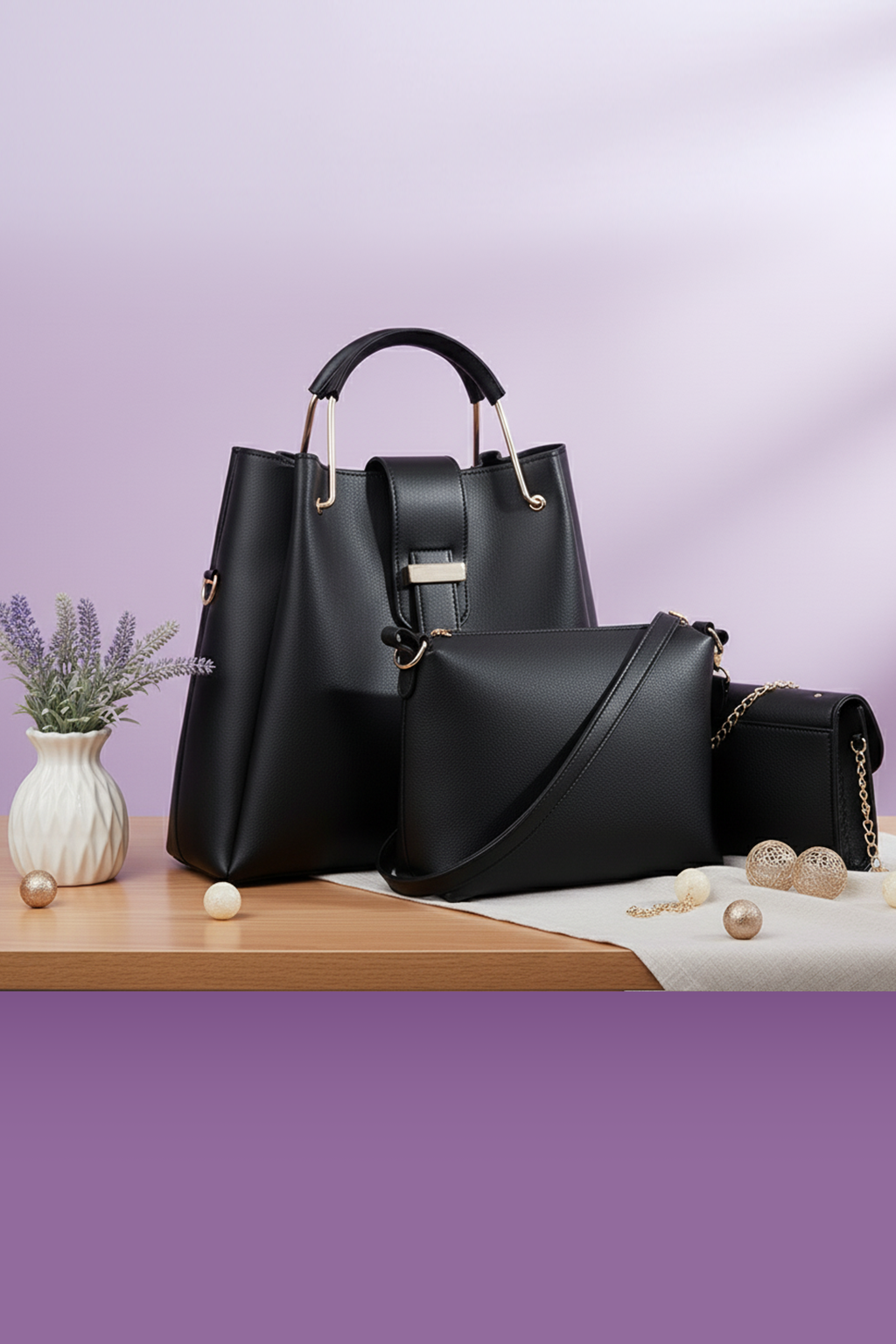 This 3-piece classic black handbag set is the perfect combination of elegance and versatility. The collection includes a structured tote with gold-tone hardware and tassel detail, a practical crossbody bag for everyday wear, and a sleek clutch with a chain strap for special occasions. Crafted from premium faux leather, this timeless set complements both casual and formal outfits, making it an essential addition to your wardrobe.