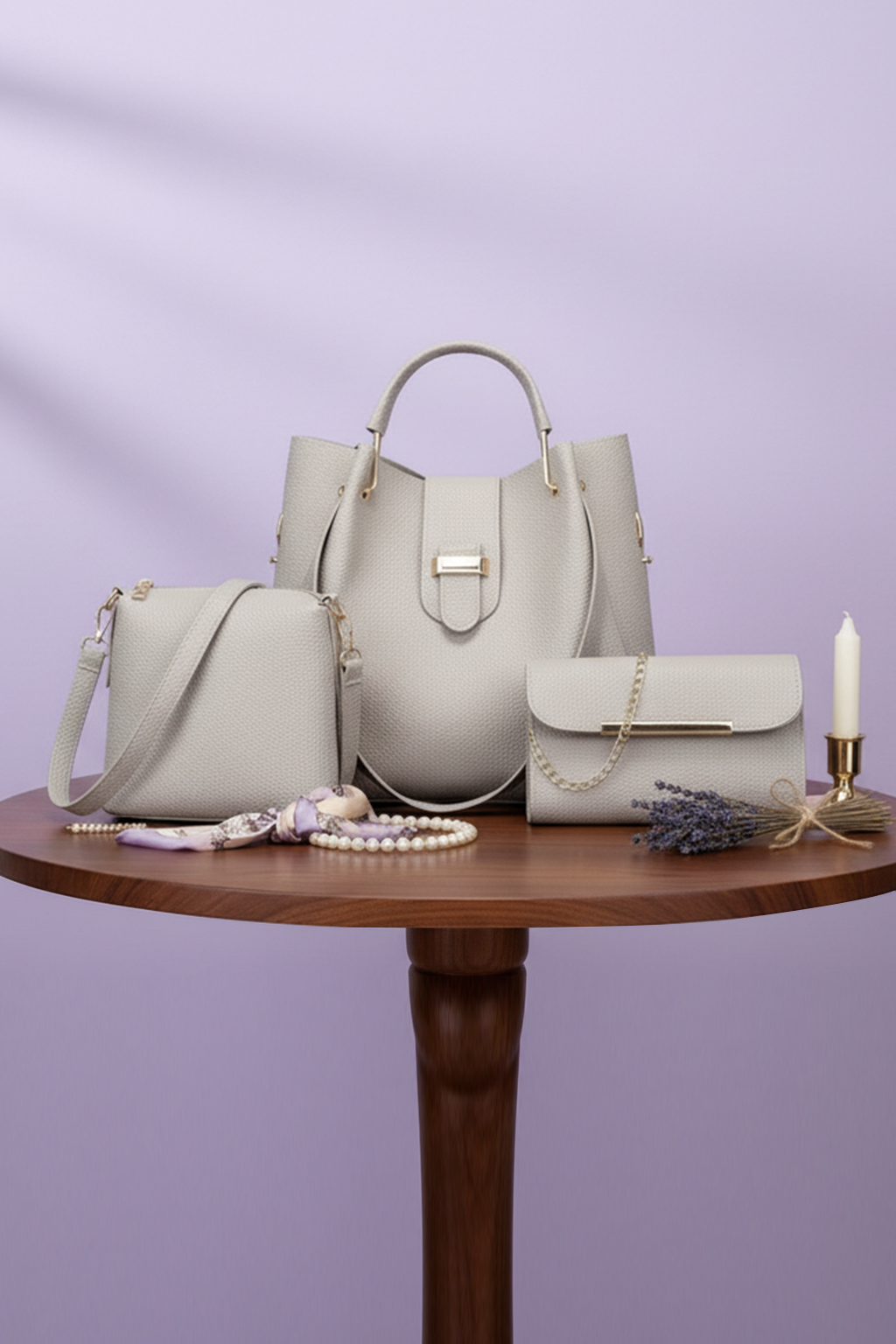 This light grey 3-piece handbag set exudes elegance and versatility, perfect for any occasion. The set includes a structured tote with a modern clasp design, a spacious crossbody bag for everyday use, and a sleek clutch with a delicate gold chain accent. Made from high-quality textured material, these bags combine functionality with refined style, making them essential staples for a polished and sophisticated look.