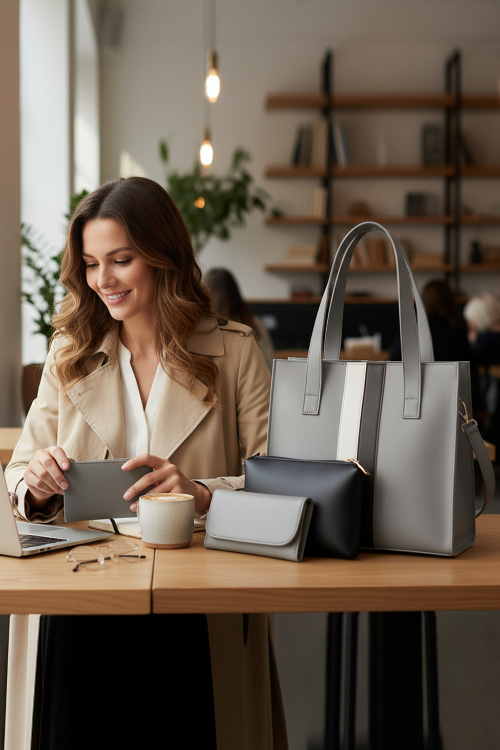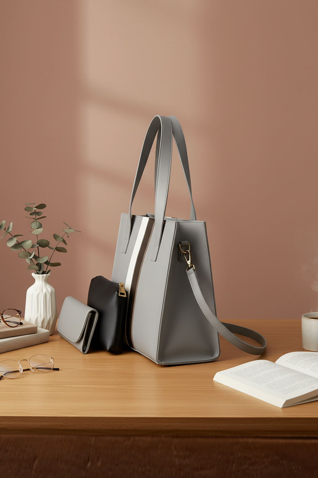 This 3-piece handbag set blends sophistication with everyday practicality. The structured grey tote features a stylish black and white stripe design, paired with a matching zip pouch and wallet. Made from premium faux leather, this versatile set is perfect for work, casual outings, or travel, offering both elegance and functionality in one.