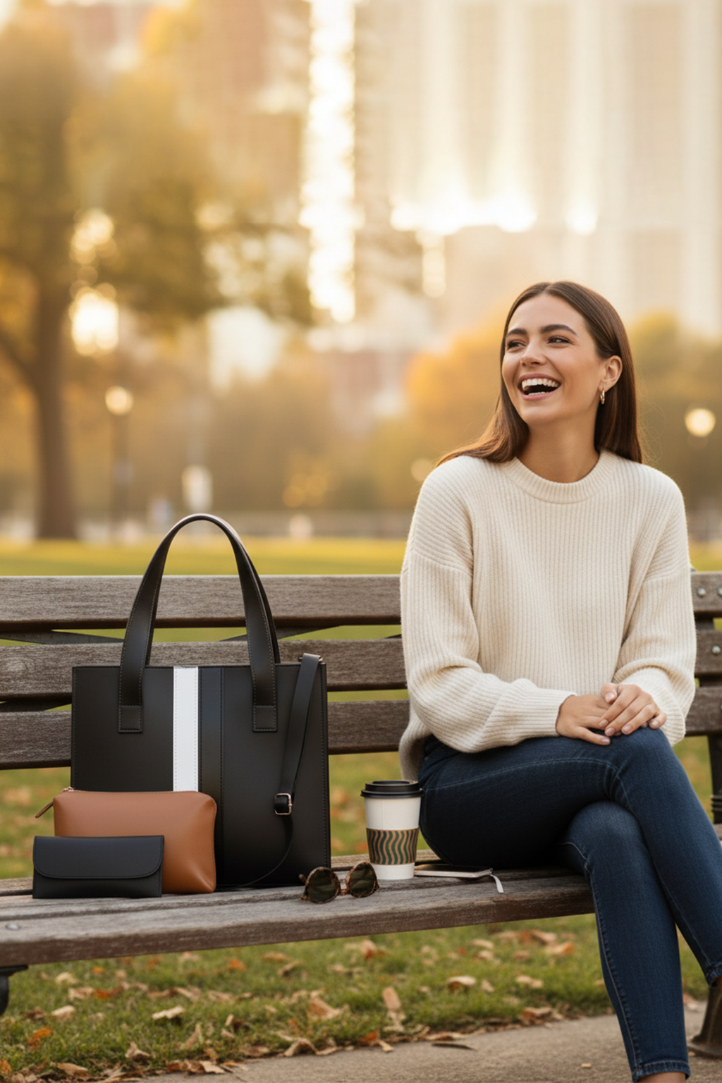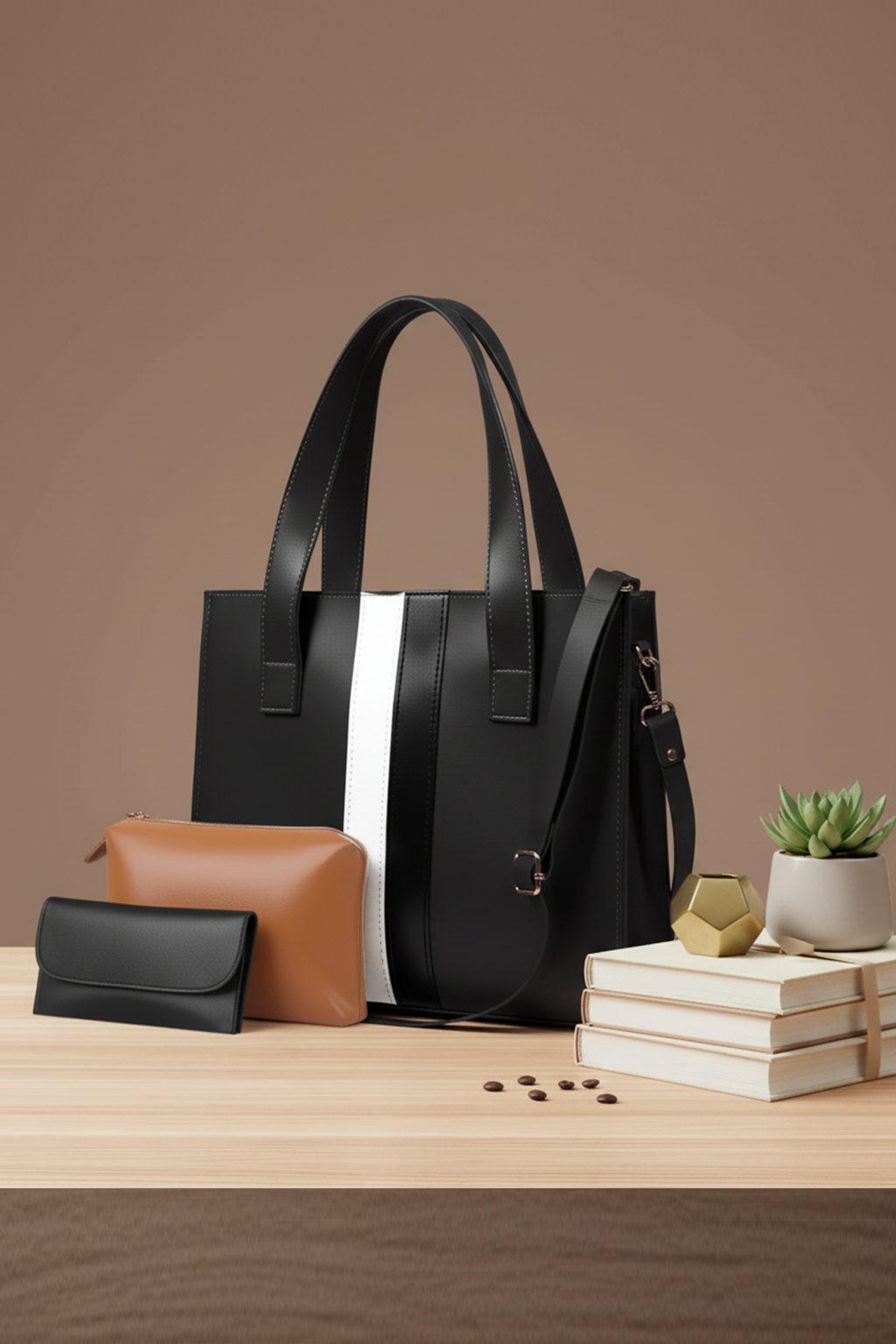 Elevate your style with this 3-piece handbag set featuring a chic striped design. The spacious brown tote is accented with bold black and white stripes, complemented by a matching zip pouch and wallet. Crafted from high-quality faux leather, this set combines elegance with functionality, making it the perfect choice for work, shopping, or casual outings.