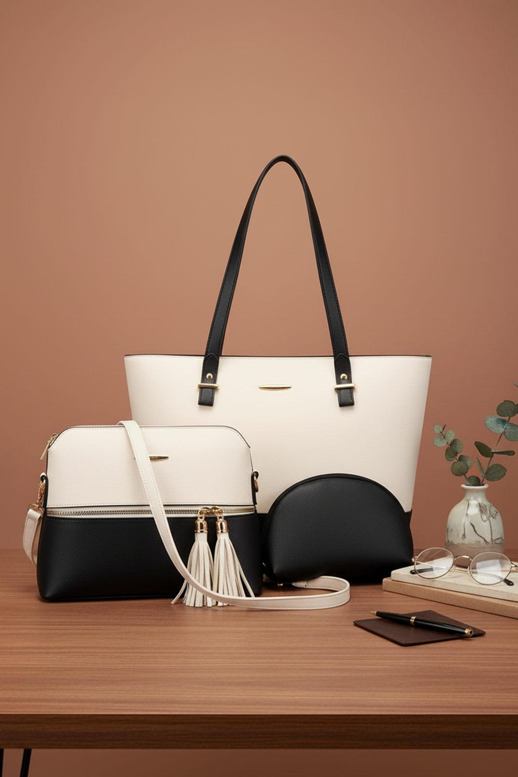 This timeless 3-piece handbag set combines elegance with everyday practicality. The set includes a large tote bag with long double handles, a medium-sized crossbody bag with an adjustable strap, and a small pouch for essentials. Made from premium faux leather, the bags feature a refined ivory white and black color contrast, accented with gold-tone hardware. The crossbody bag is enhanced with chic tassel zipper pulls for a modern touch. Perfect for work, travel, shopping, or casual outings, this versatile set offers both style and functionality in one.
