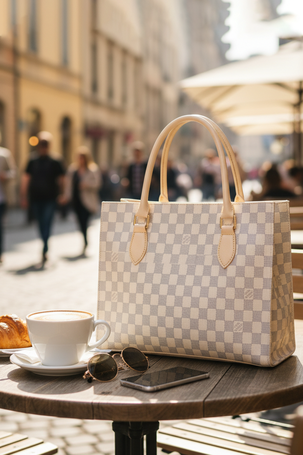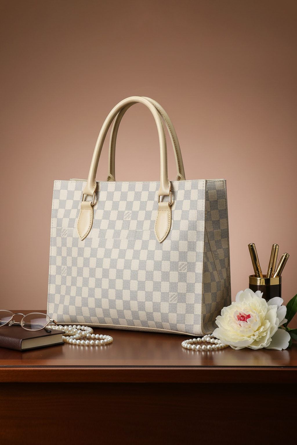 As an industry expert, this large size Kaeluxe tote offers 100% genuine checkered signature print, spacious interior and multiple pockets for storage. This stylish tote is perfect for work or travel, providing both functionality and fashion in one package.
