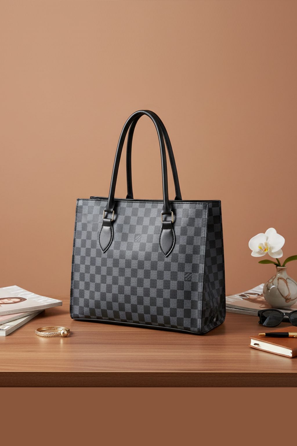 As an industry expert, this large size Kaeluxe tote offers 100% genuine checkered signature print, spacious interior and multiple pockets for storage. This stylish tote is perfect for work or travel, providing both functionality and fashion in one package.