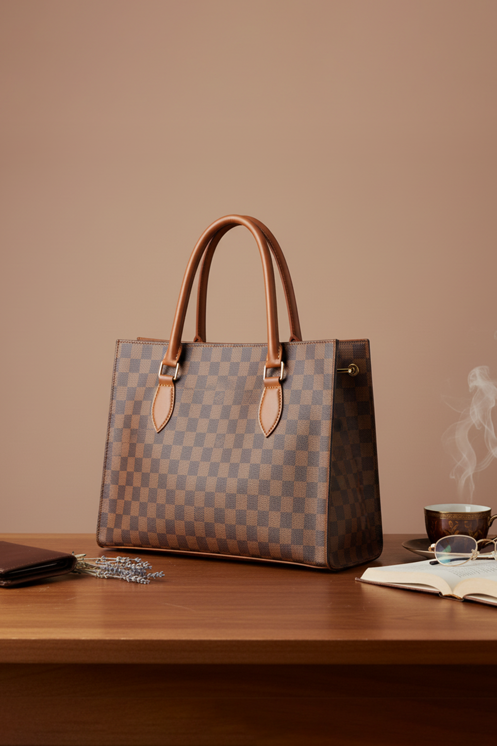As an industry expert, this large size Kaeluxe tote offers 100% genuine checkered signature print, spacious interior and multiple pockets for storage. This stylish tote is perfect for work or travel, providing both functionality and fashion in one package.