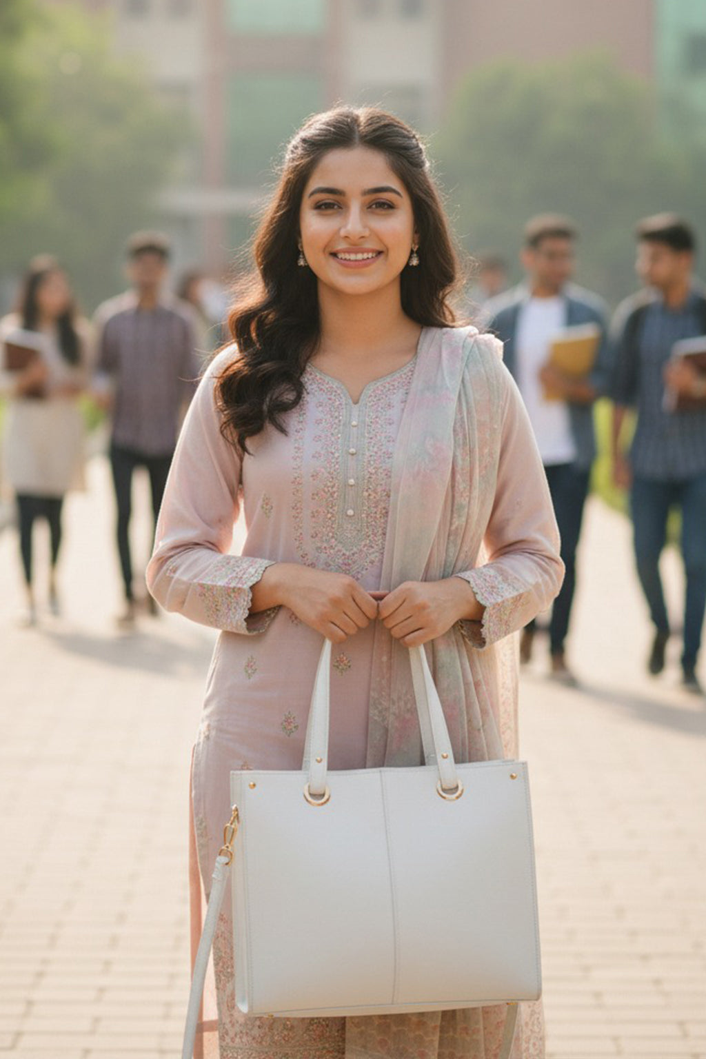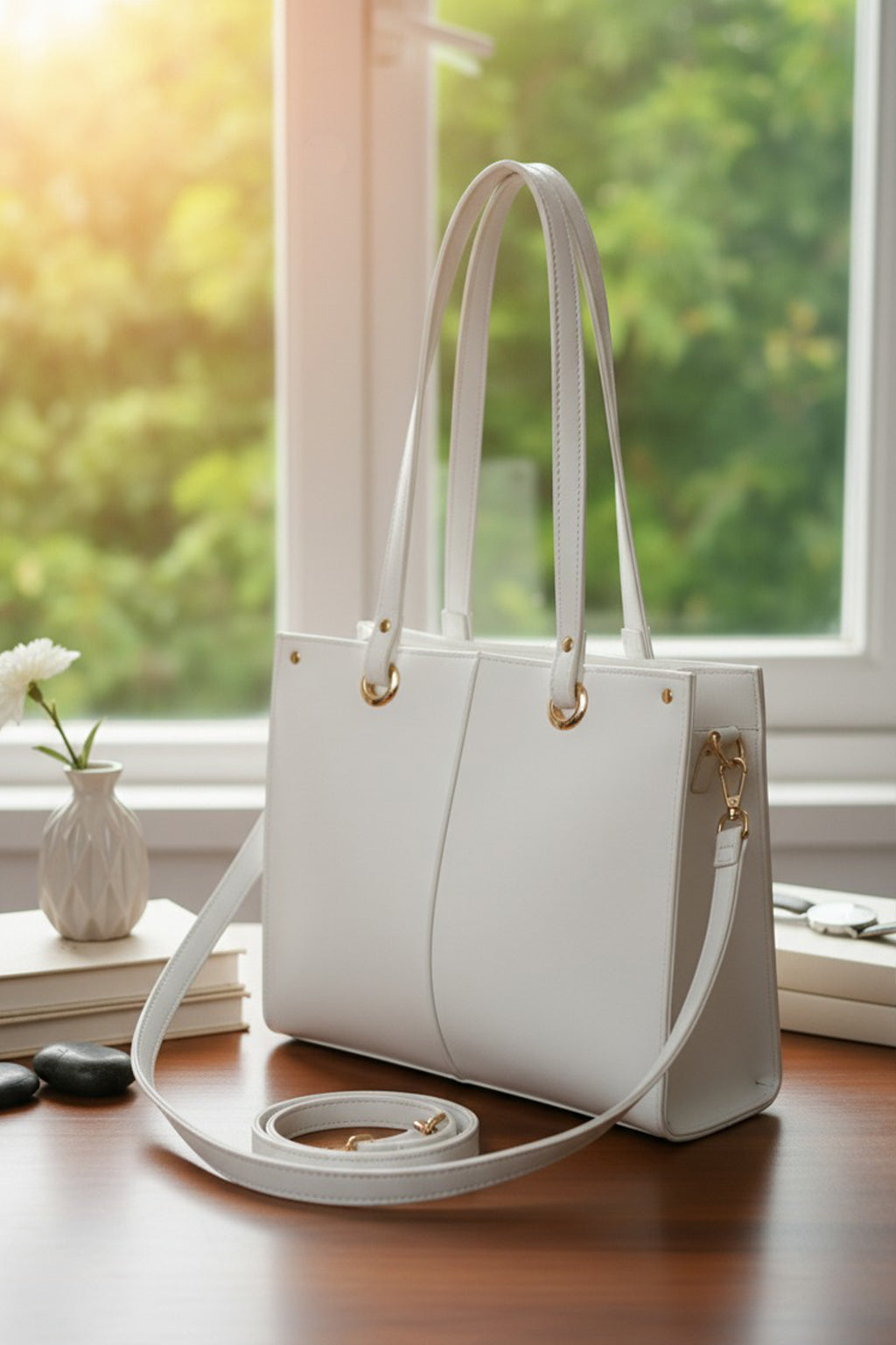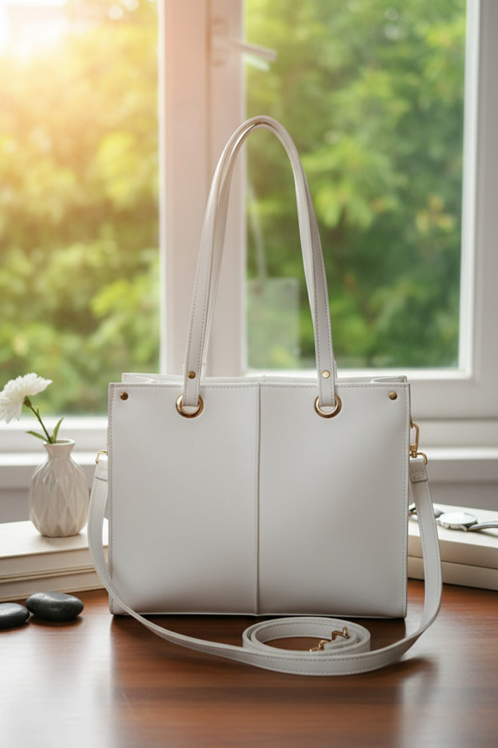 This chic tote bag is crafted from premium faux leather in a refined pearl white finish, perfect for elevating both casual and professional looks. Designed with long handles for easy shoulder carrying and a detachable strap for crossbody convenience, it offers versatile wear options. Gold-tone hardware adds a touch of elegance, while the structured silhouette provides ample space for daily essentials. Stylish and practical, this tote is ideal for work, travel, or everyday use.