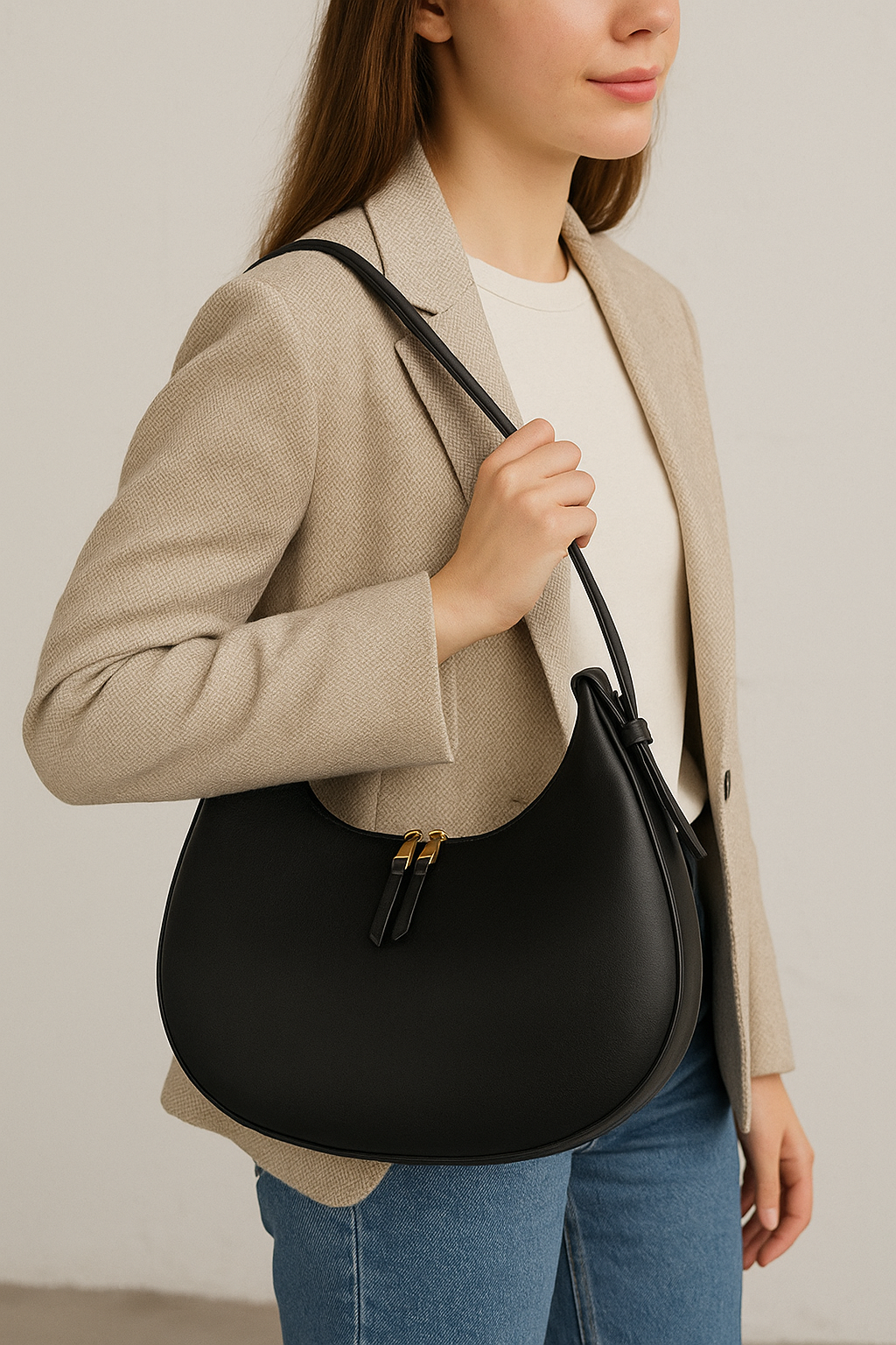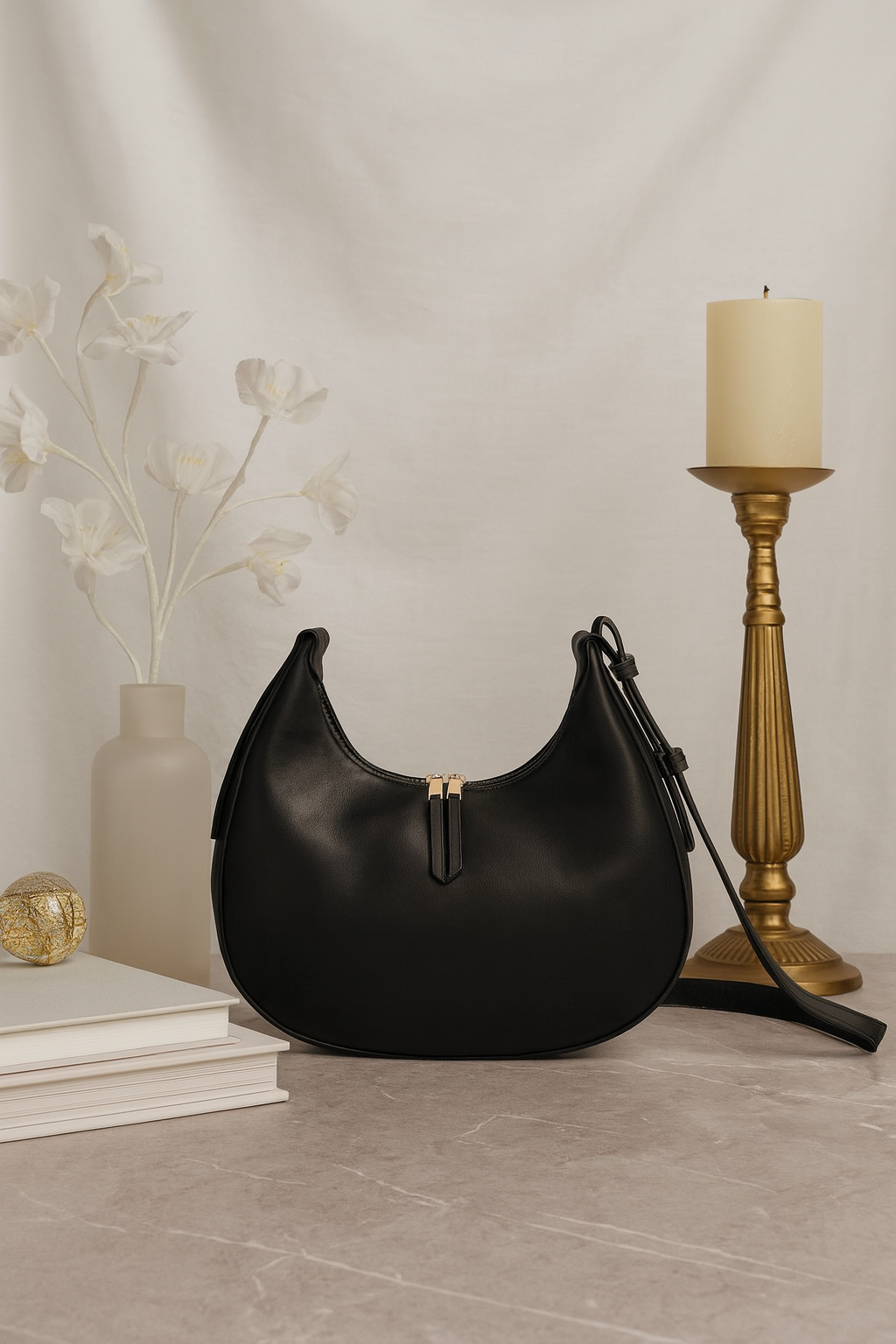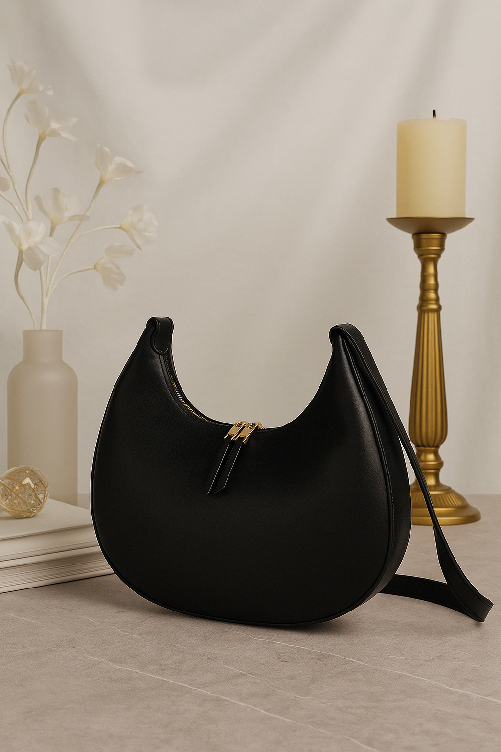 This sleek black hobo shoulder bag is a timeless accessory designed with a smooth crescent silhouette. Made from premium faux leather, it features a secure zip closure with dual pull tabs and minimal gold-tone hardware for a touch of elegance. The spacious interior makes it practical for carrying daily essentials, while the adjustable strap allows for comfortable crossbody or shoulder wear. A versatile bag that transitions effortlessly from day to evening.