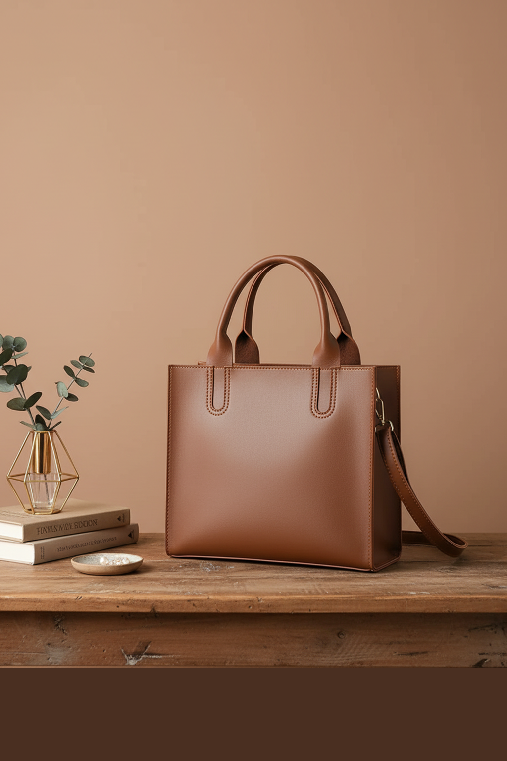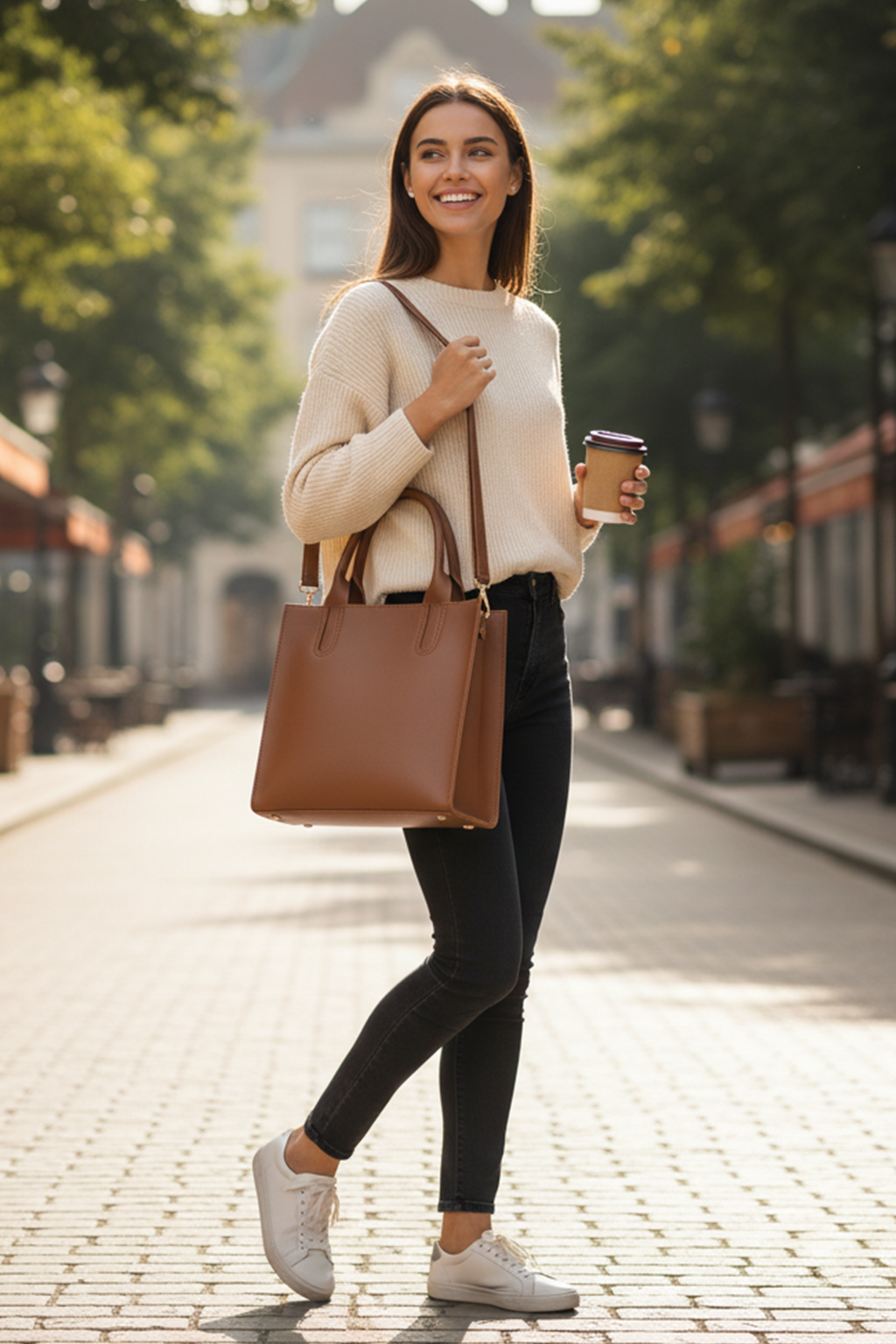 This elegant tote bag is crafted from high-quality faux leather, designed with a sleek and structured silhouette for a timeless look. Featuring dual top handles and a detachable shoulder strap, it offers versatile carrying options for both casual outings and professional settings. The smooth caramel brown finish adds a touch of sophistication, making it a perfect everyday accessory to complement any outfit. Spacious enough to hold your daily essentials while maintaining a minimalist aesthetic.