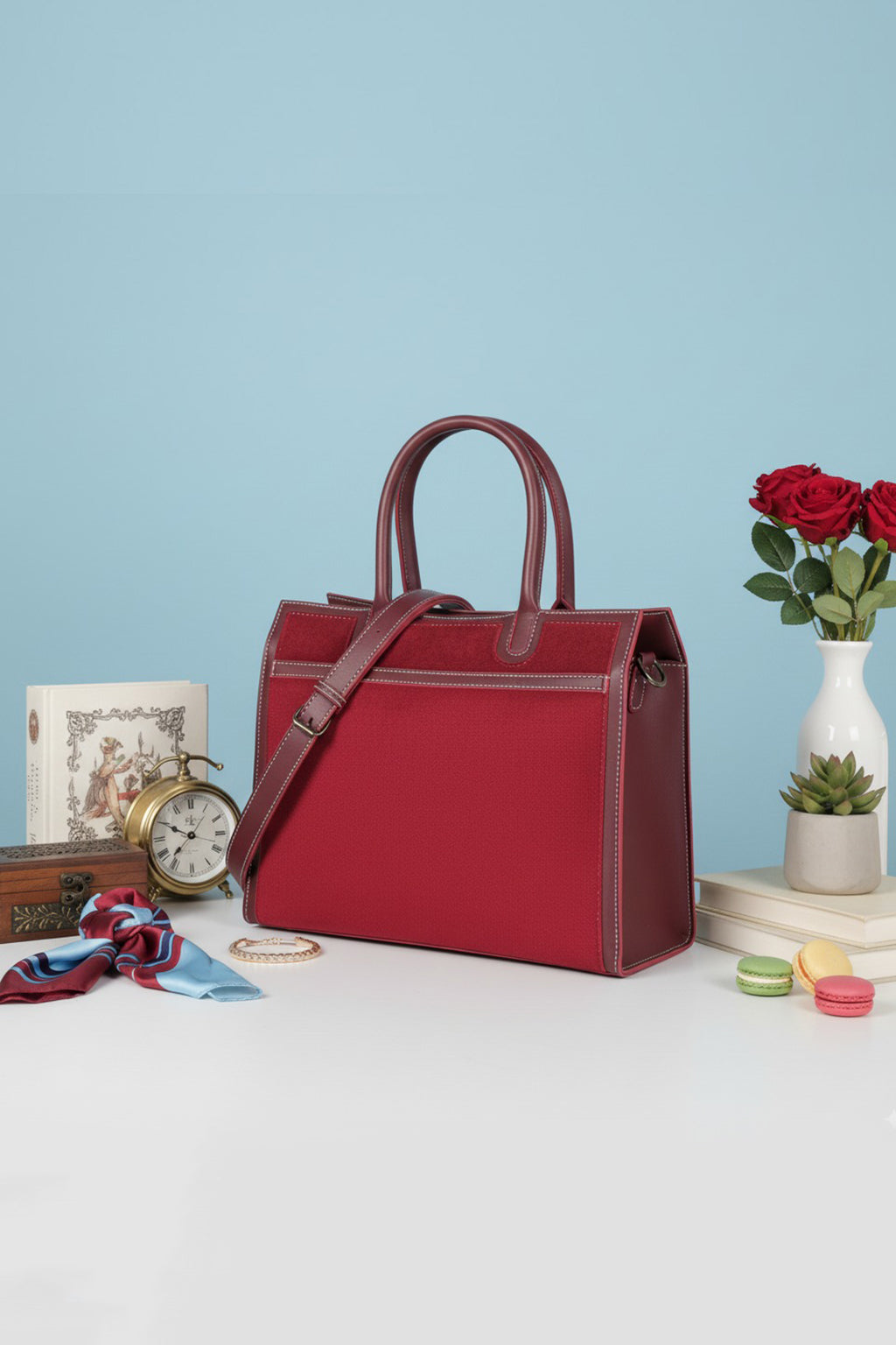 This timeless tote bag is designed in a rich deep red with elegant burgundy leather trim and contrast stitching. Featuring a structured silhouette, it offers both sturdy top handles and a detachable adjustable shoulder strap for versatile carrying options. The spacious interior ensures ample room for daily essentials, making it perfect for work, travel, or casual outings. Sophisticated yet practical, this bag adds a refined pop of colour to any wardrobe.