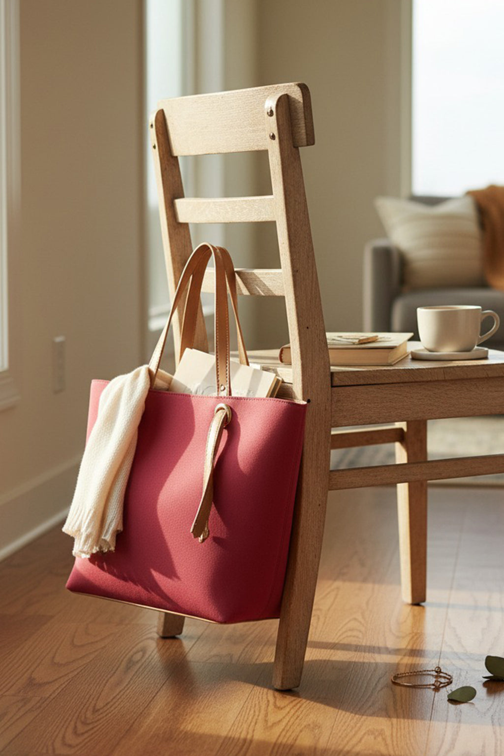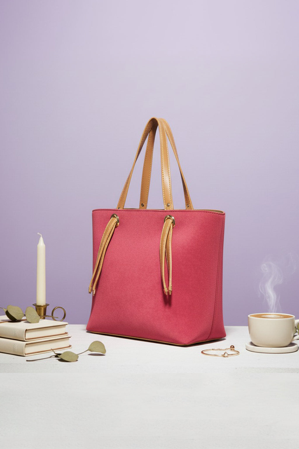 A chic tote bag designed in a rich deep rose red suede-style finish, complemented by sleek tan handles with gold-tone accents. Its minimal yet sophisticated drawstring detailing adds a modern touch, while the spacious interior makes it perfect for carrying daily essentials. Ideal for work, shopping, or casual outings, this bag blends practicality with timeless elegance.