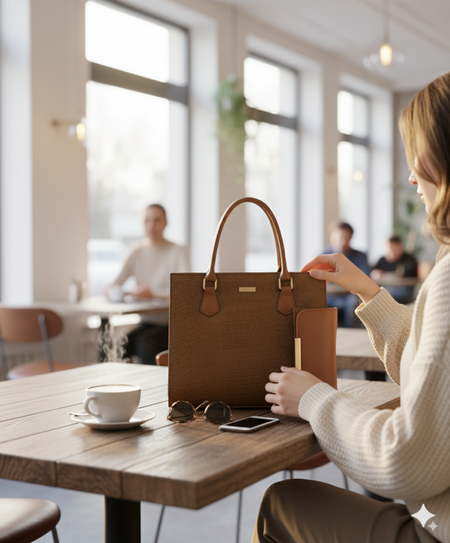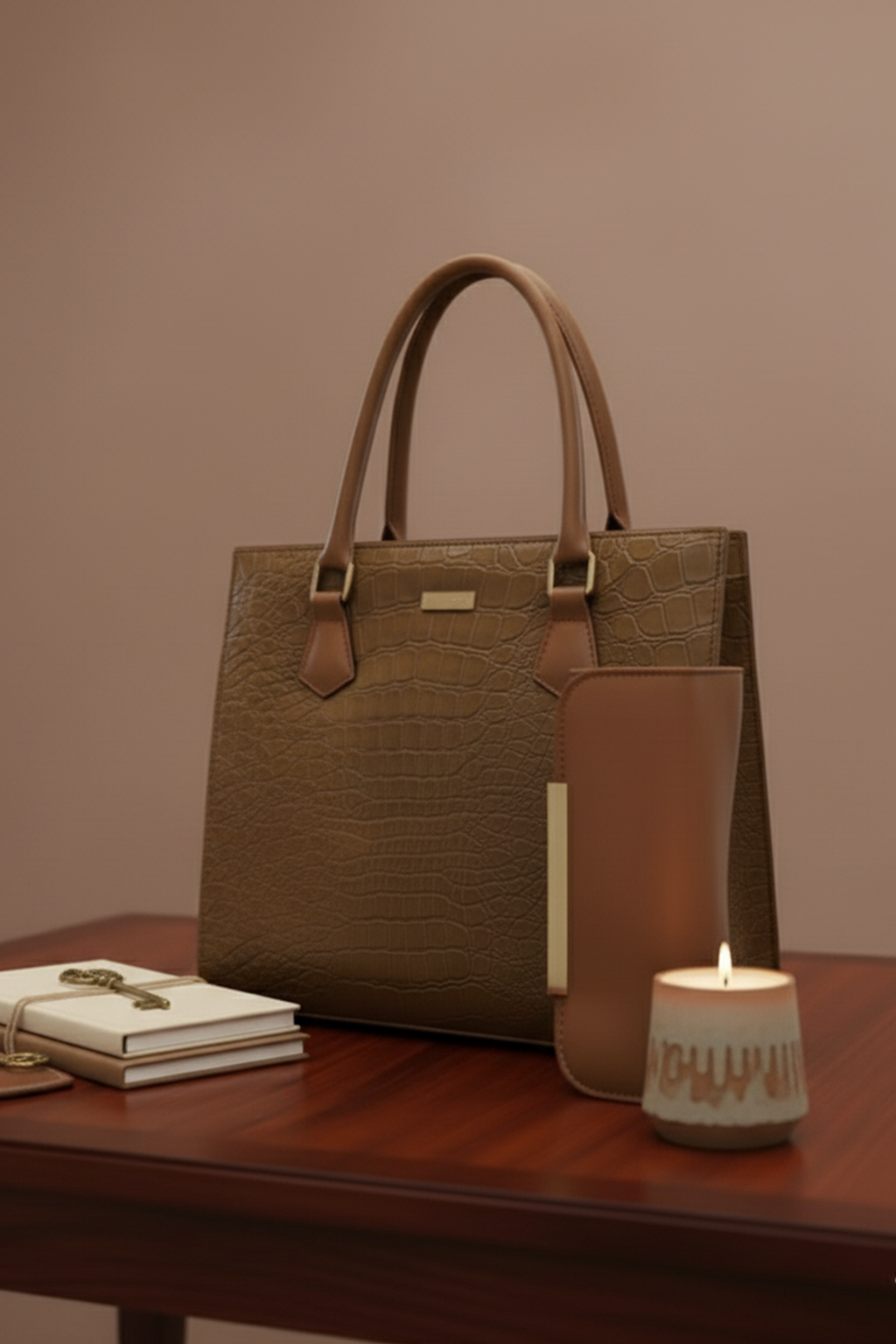 Elevate your style with this croc-embossed tote bag set in a sophisticated coffee brown shade. Designed with structured handles and metallic accents, the spacious tote is perfect for work, meetings, or casual outings. The set includes a sleek matching clutch for a refined touch, making it both stylish and versatile for any occasion. Crafted from premium faux leather, this set combines elegance with everyday functionality.