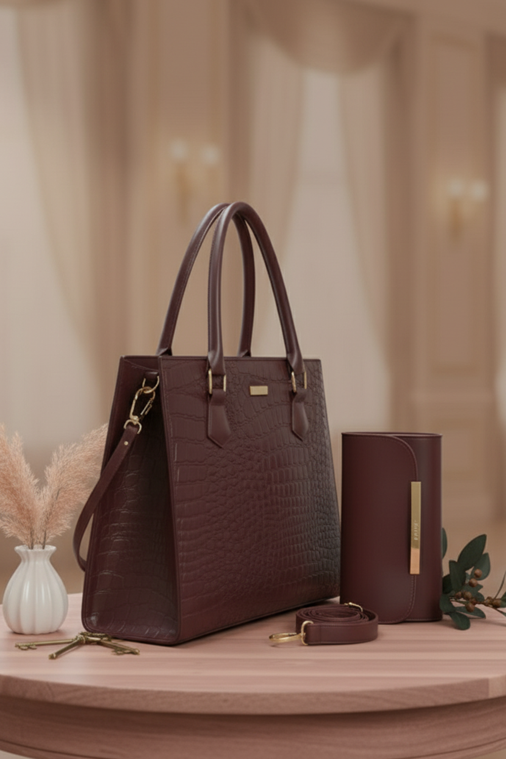 Elevate your look with this sophisticated croc-embossed tote bag set in a rich deep maroon shade. The tote features a structured silhouette with sturdy top handles and a detachable shoulder strap for versatile carrying options. Paired with a sleek matching clutch, this set is perfect for both work and special occasions. Crafted from premium-quality faux leather, it offers durability, style, and timeless elegance in one.