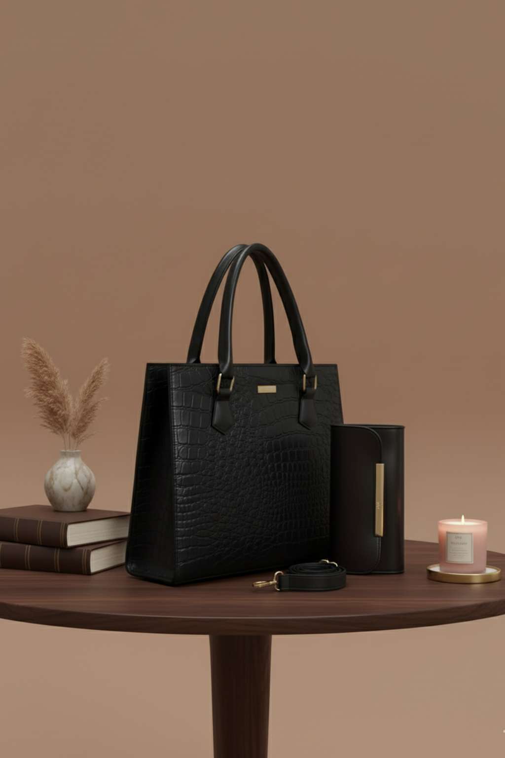 A timeless piece that exudes elegance, this croc-embossed tote bag set in classic black is perfect for any occasion. The tote features a structured design with sturdy top handles and a detachable shoulder strap for versatile styling. Paired with a matching sleek clutch, this set combines practicality with high fashion. Made from premium-quality faux leather with gold-tone accents, it’s the ultimate choice for a polished and sophisticated look.