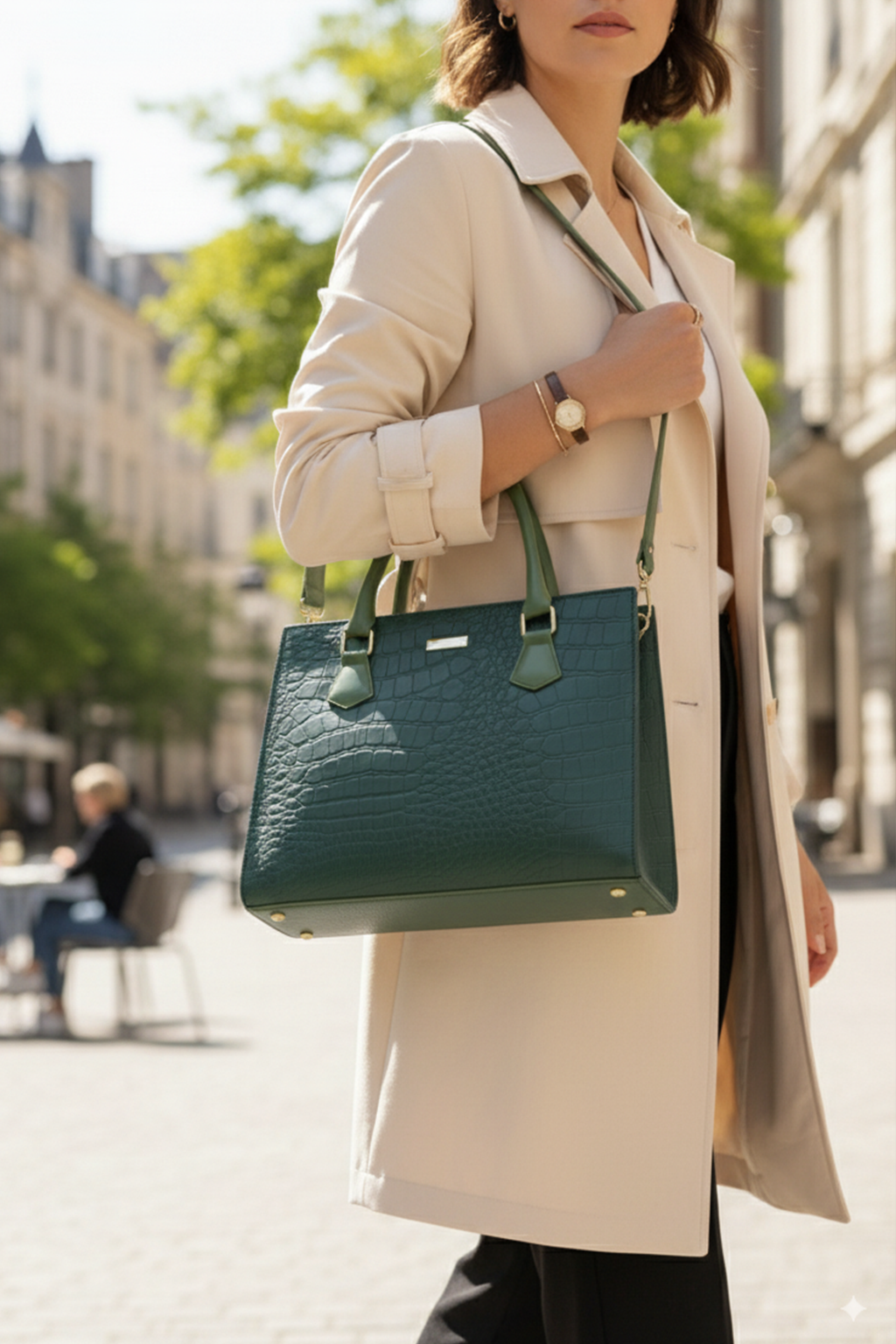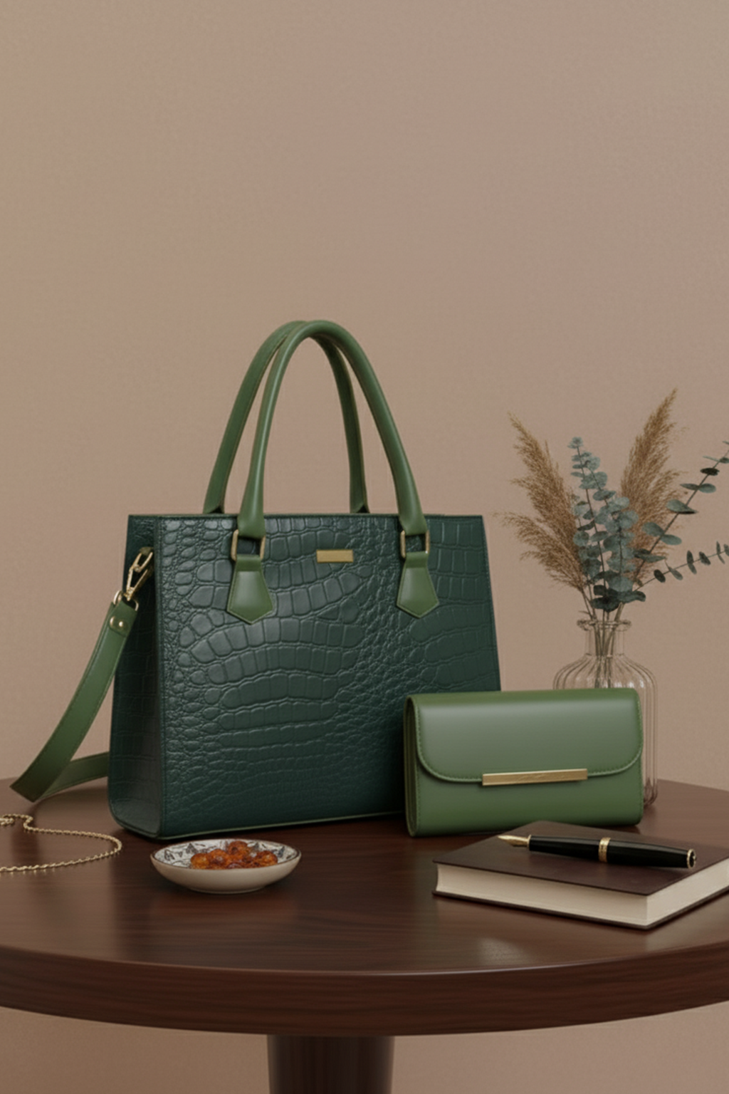 Add a bold statement to your wardrobe with this croc-embossed tote bag set in a striking forest green shade. The spacious tote features dual handles, a detachable shoulder strap, and a structured design for everyday practicality. Paired with a sleek matching wallet, this set blends elegance with utility, making it perfect for work, shopping, or social occasions. Crafted from high-quality faux leather, it offers durability with a fashionable edge.
