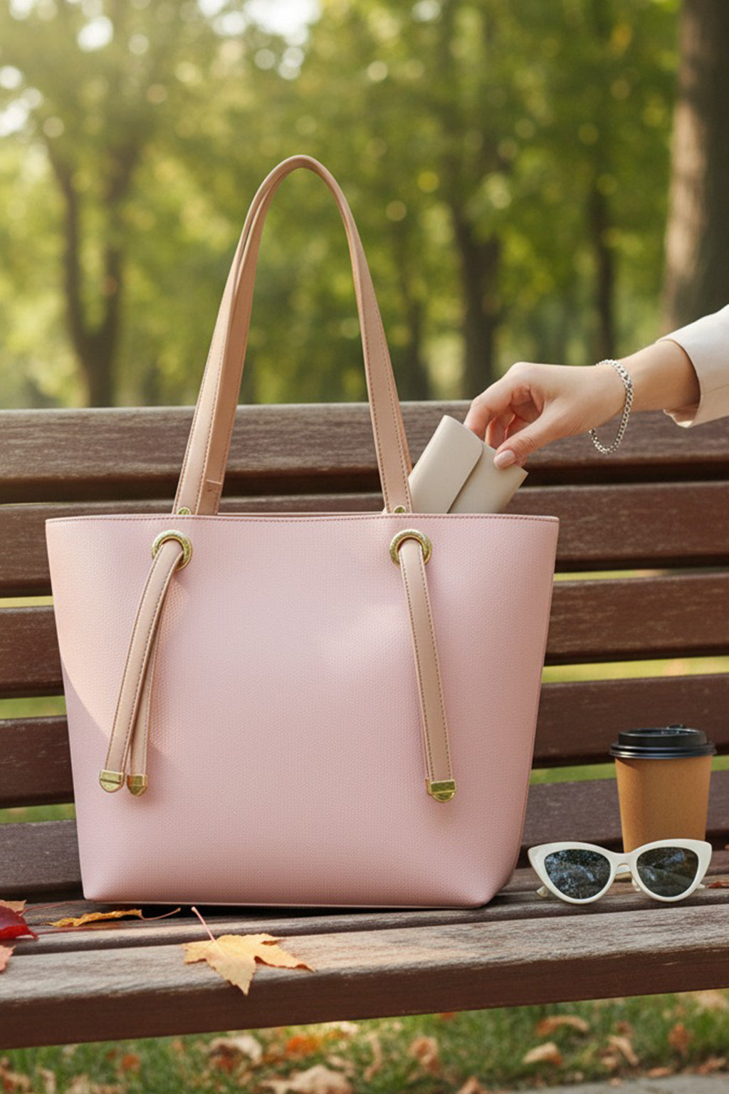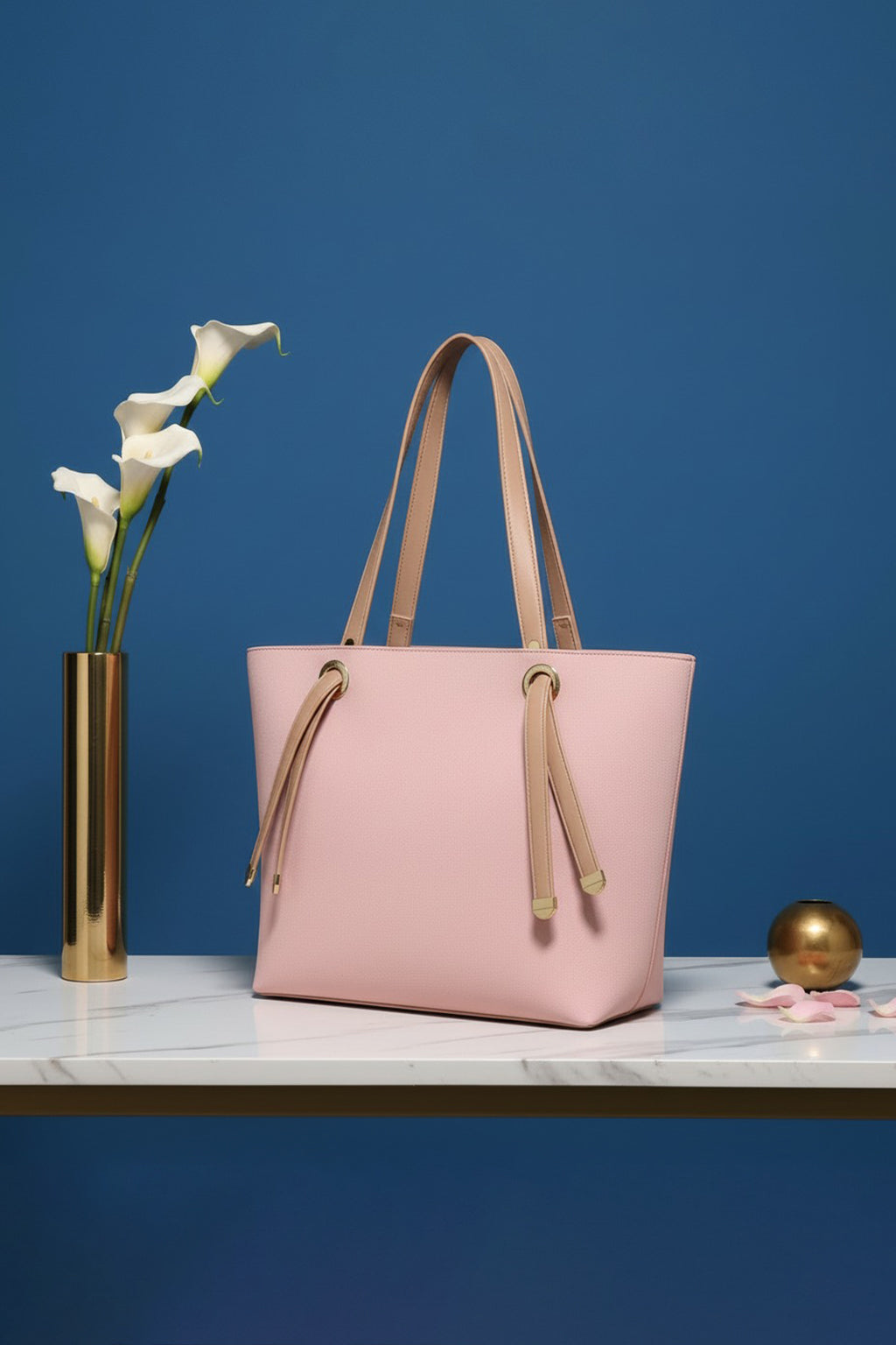 A stylish and modern tote bag in soft pink, featuring sleek beige handles and chic drawstring detailing with metallic accents. Crafted for everyday elegance, this bag offers both fashion and function with its spacious interior and structured design. Perfect for work, casual outings, or special occasions, it adds a touch of sophistication to any outfit.