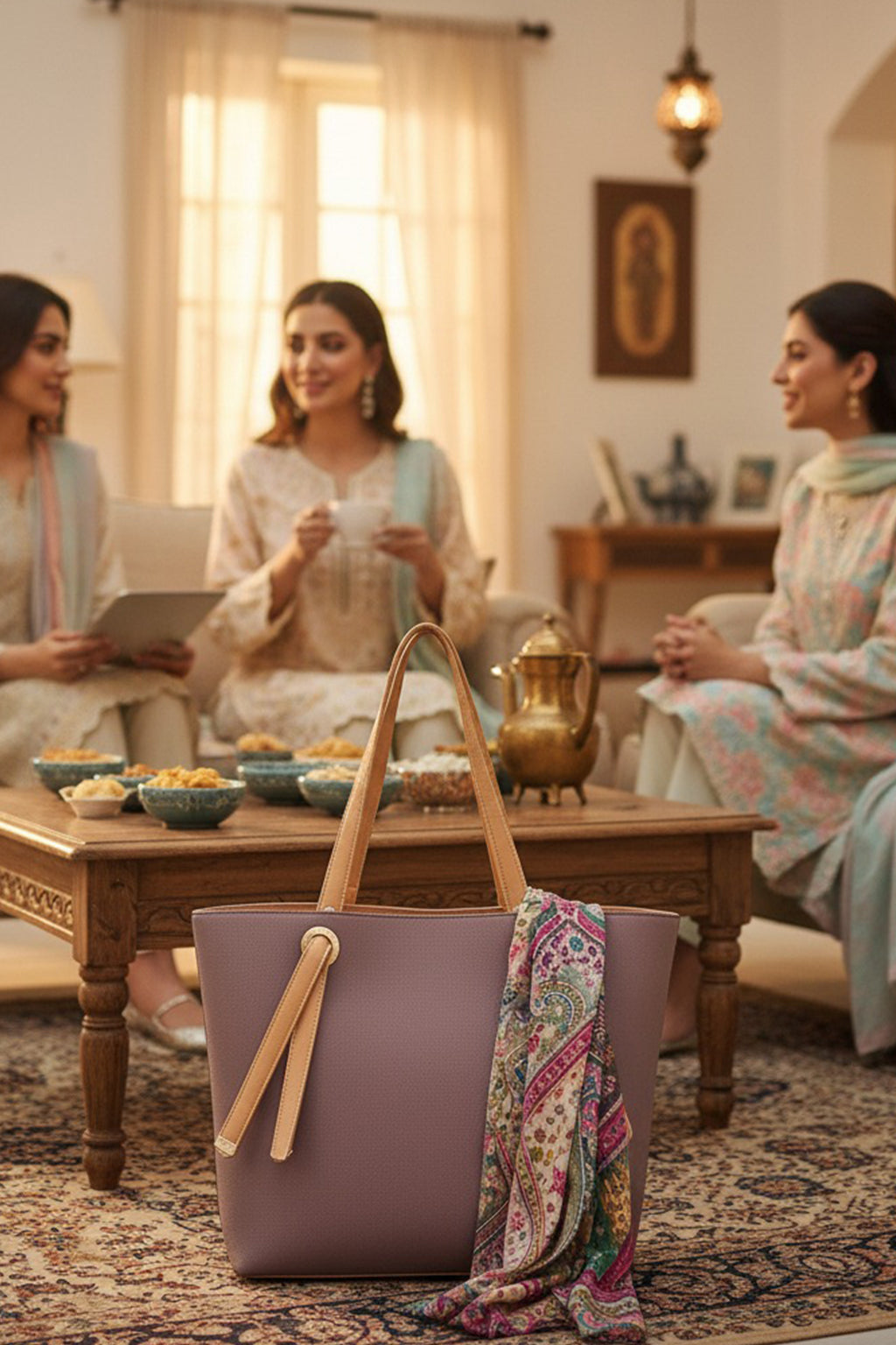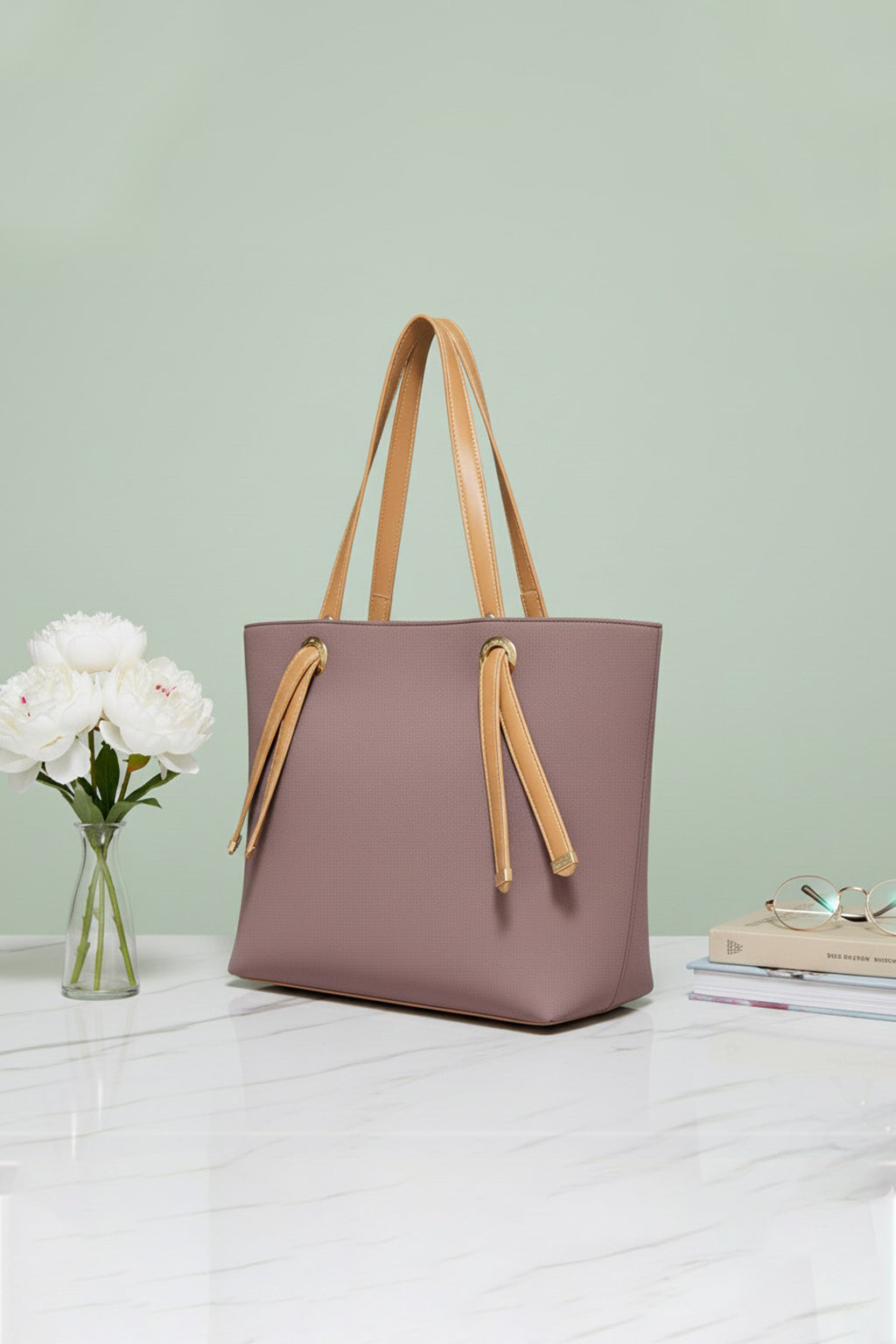 This elegant tote bag comes in a soft mauve shade, beautifully complemented by beige handles with gold-tone hardware. The minimal drawstring-style detailing adds a refined touch, while the spacious design offers ample room for everyday essentials. Perfect for both work and casual outings, this versatile bag blends functionality with timeless sophistication.
