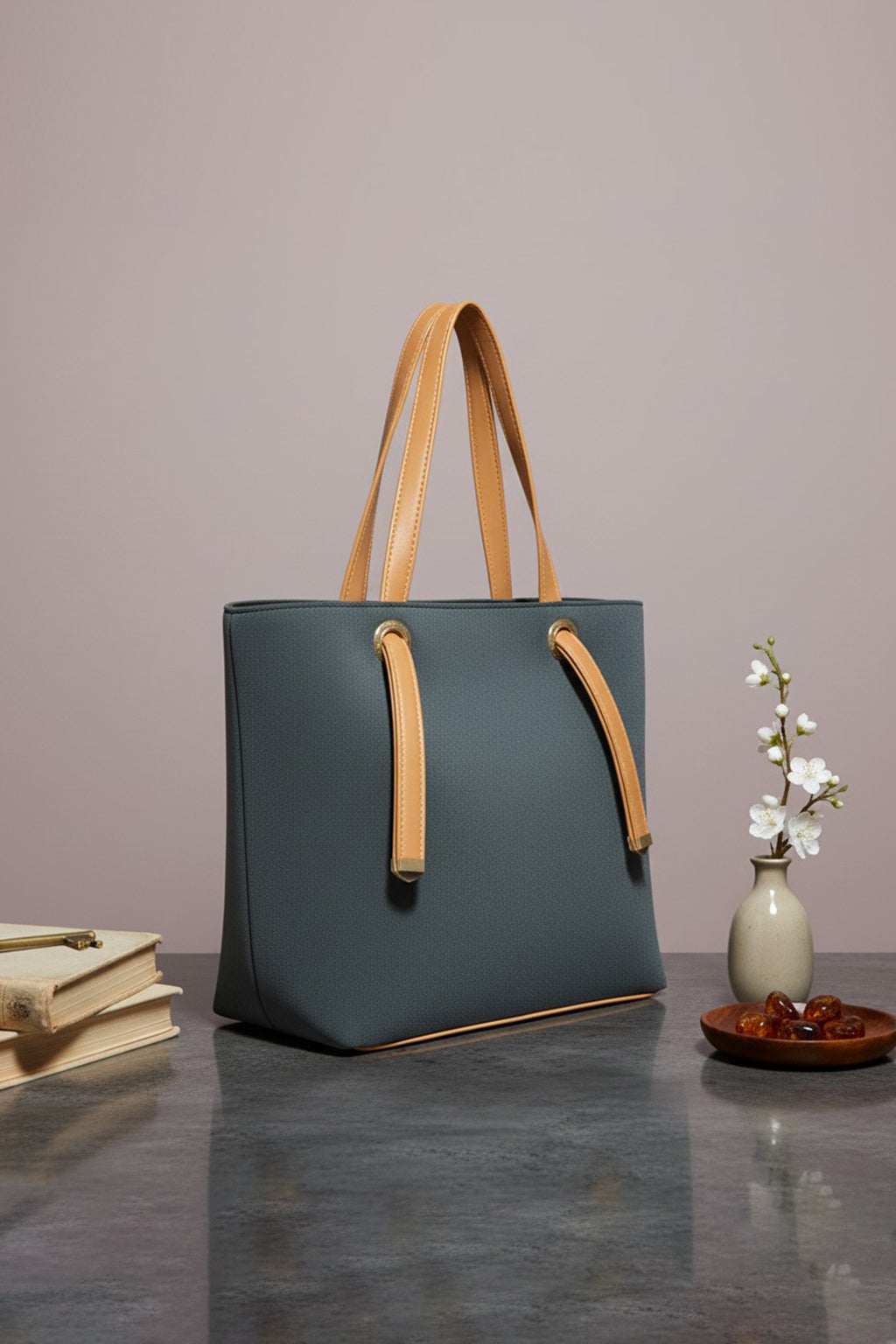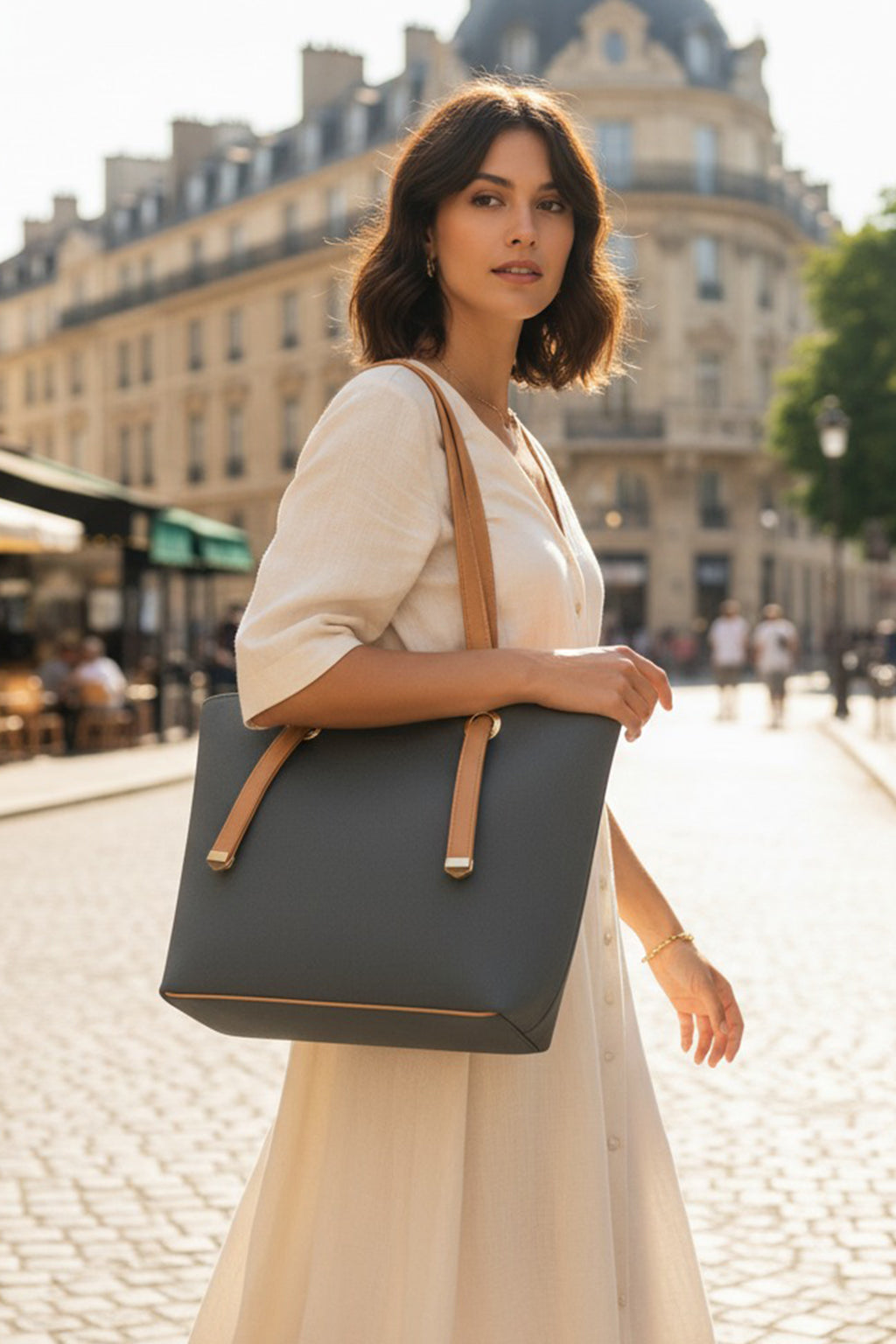 This elegant tote bag in charcoal grey is complemented by contrasting tan handles for a timeless and versatile style. Designed with gold-tone accents and elongated strap detailing, it offers a chic balance of sophistication and everyday practicality. Perfect for work, shopping, or casual outings, its spacious interior ensures you carry your essentials with ease and style.