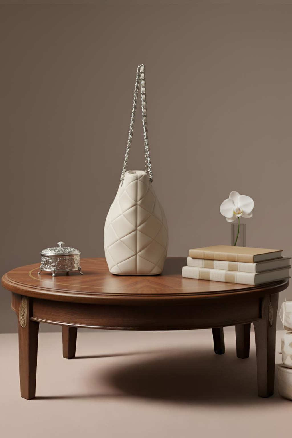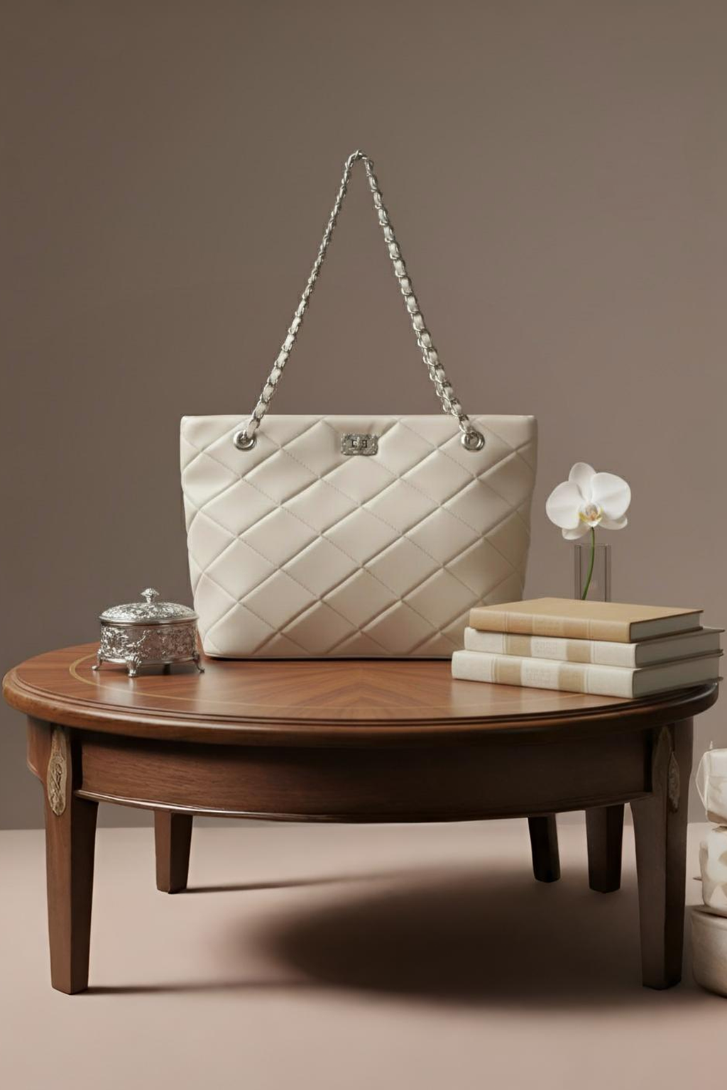This classic ivory quilted chain shoulder bag is the epitome of timeless sophistication. Featuring a diamond-stitched design and a silver-tone chain strap interwoven with leather, it blends luxury with practicality. The soft ivory shade enhances its versatility, making it perfect for pairing with both casual chic and elegant evening ensembles. Spacious and stylish, this bag is an ideal accessory for the modern woman who values elegance and functionality.