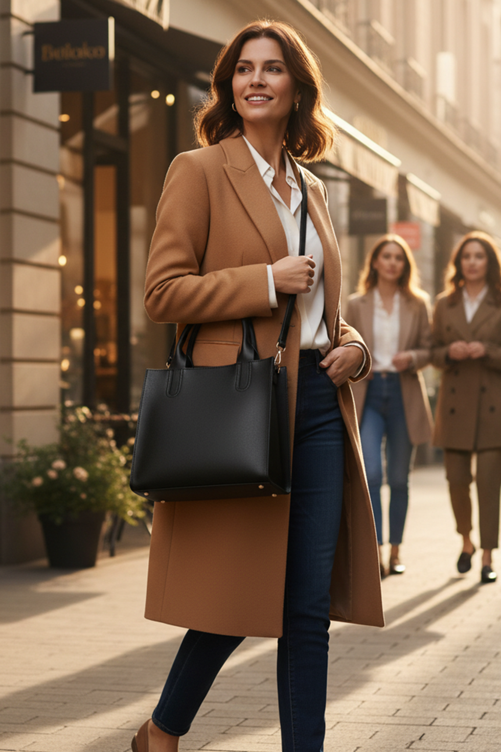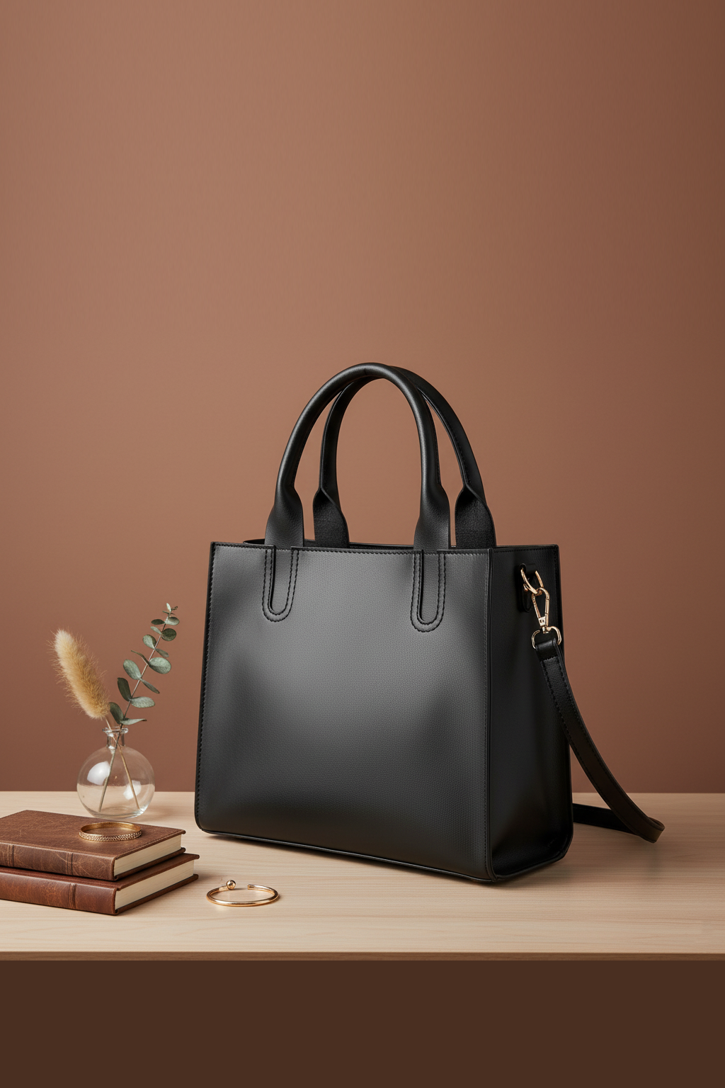 This sophisticated tote bag is designed with a clean, structured shape, crafted from premium faux leather for durability and style. The rich black finish gives it a timeless and versatile appeal, perfect for both professional and casual occasions. Featuring sturdy top handles and a detachable shoulder strap, it offers multiple carrying options to suit your needs. Spacious yet sleek, it provides ample room for daily essentials while maintaining a minimalist and polished look.