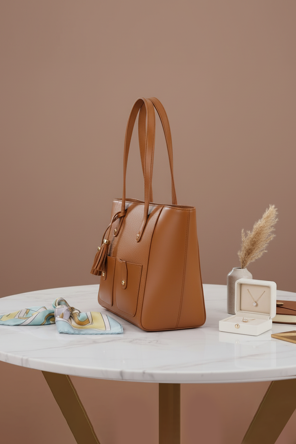 Stylish Women’s Tote Bag with Dual Front Pockets and Tassel Detail