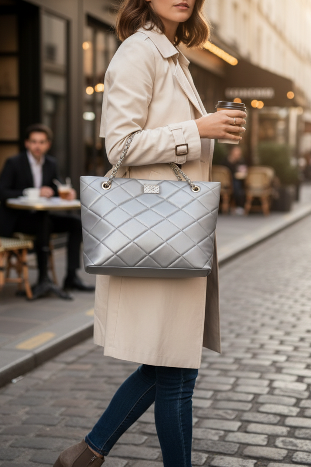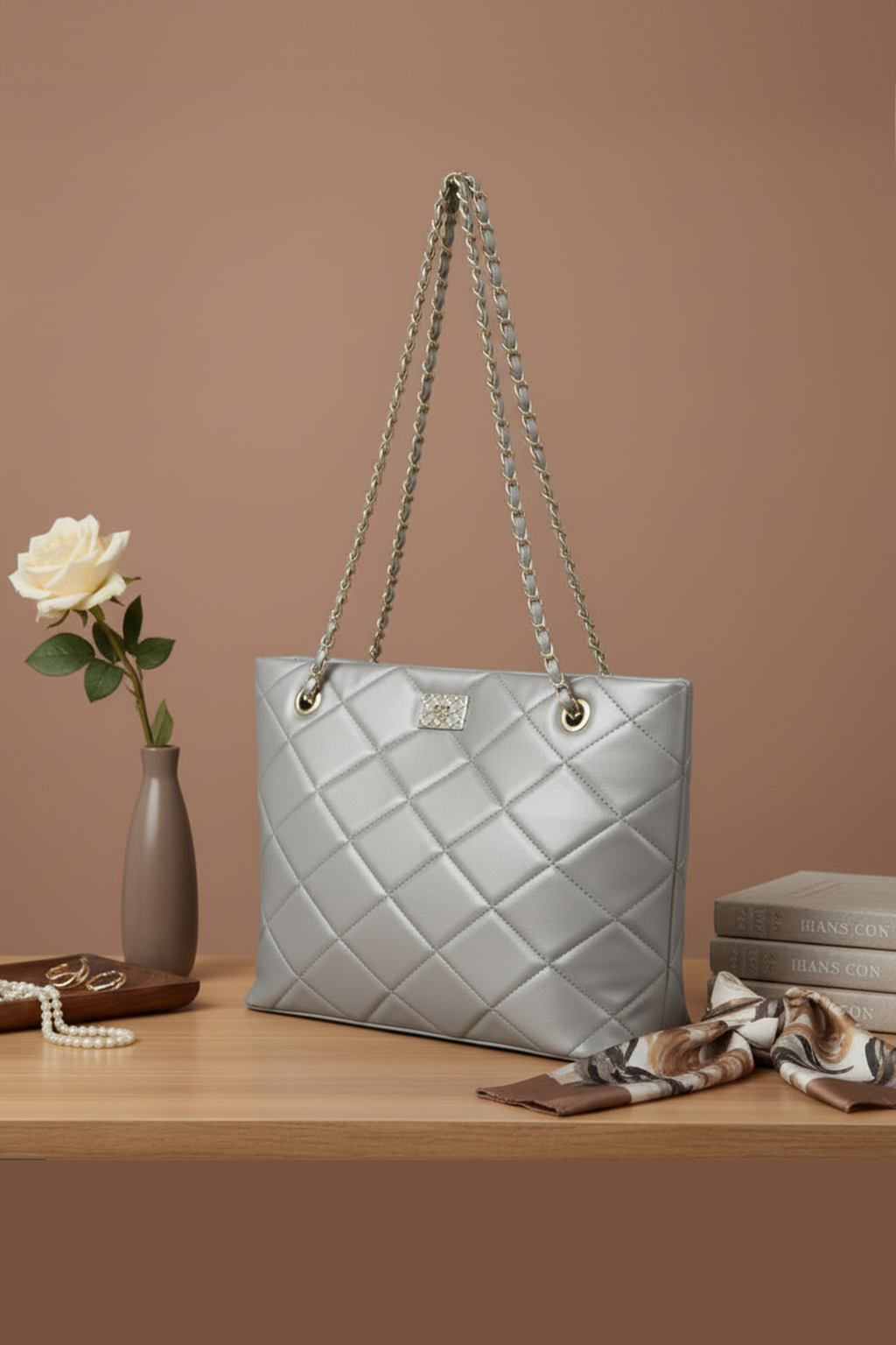 This silver grey quilted chain shoulder bag is the ultimate blend of sophistication and modern elegance. Featuring a diamond-stitched design and a sleek metallic finish, it is complemented by a gold-and-leather interlaced chain strap that adds a luxurious touch. The versatile neutral tone makes it a timeless accessory, perfect for both daytime chic and evening glamour. Spacious and stylish, it’s designed for the woman who values both fashion and functionality.