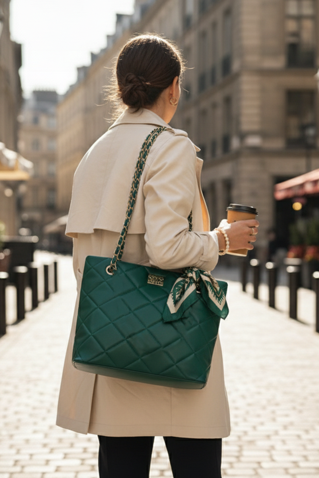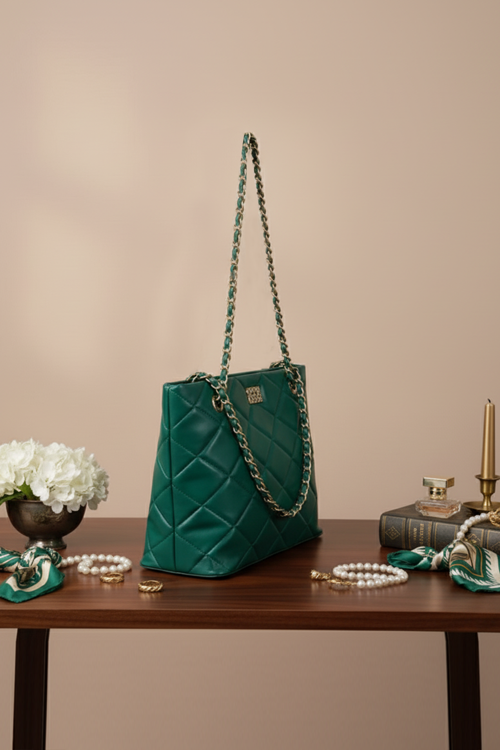 This emerald green quilted chain shoulder bag is a statement piece that exudes elegance and charm. Designed with a diamond-stitched pattern and accented with a gold-and-leather interwoven chain strap, it strikes the perfect balance between luxury and practicality. The bold emerald shade adds a vibrant yet sophisticated touch, making it ideal for elevating both day and evening looks. Spacious and versatile, it’s the perfect companion for the modern fashion-forward woman.