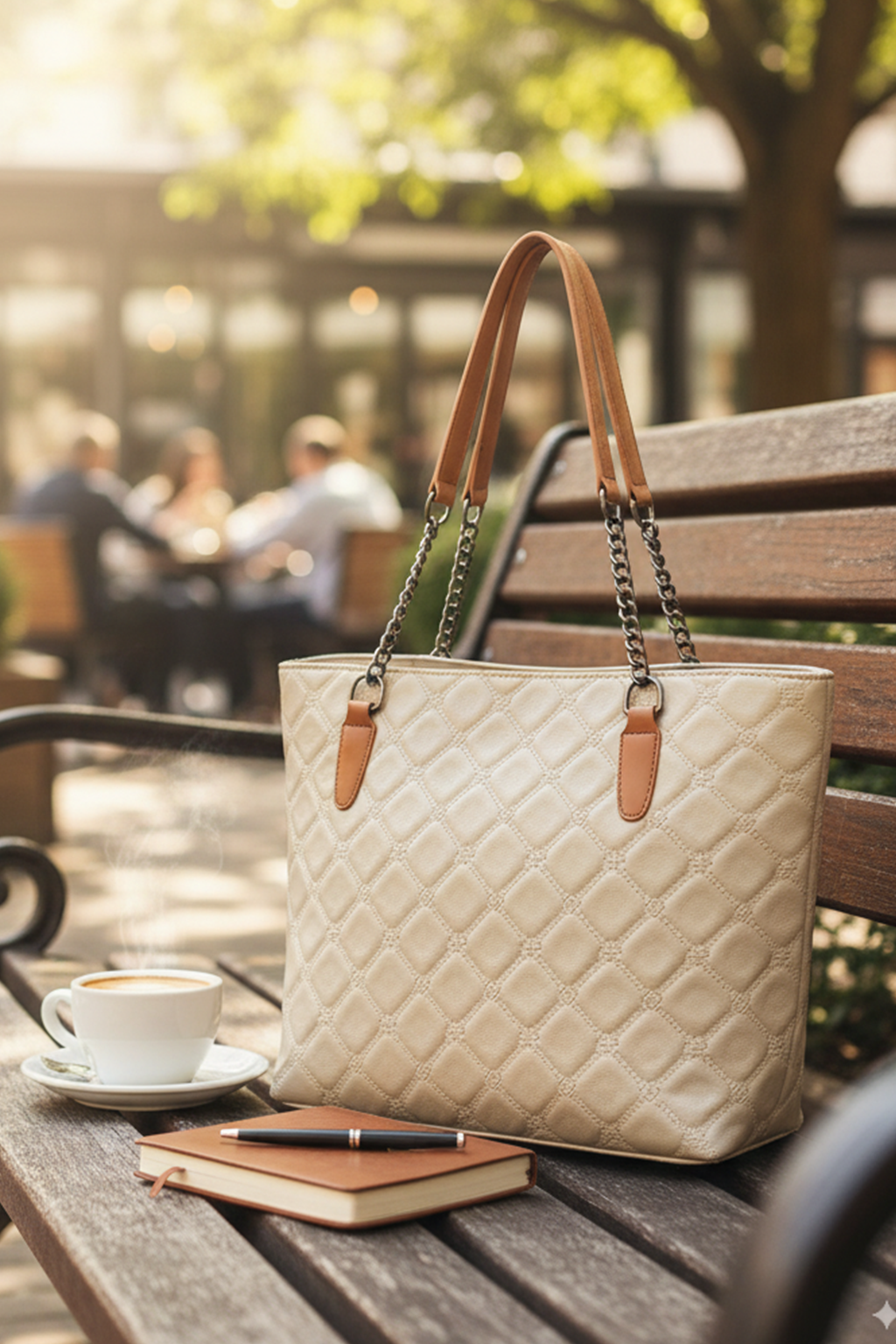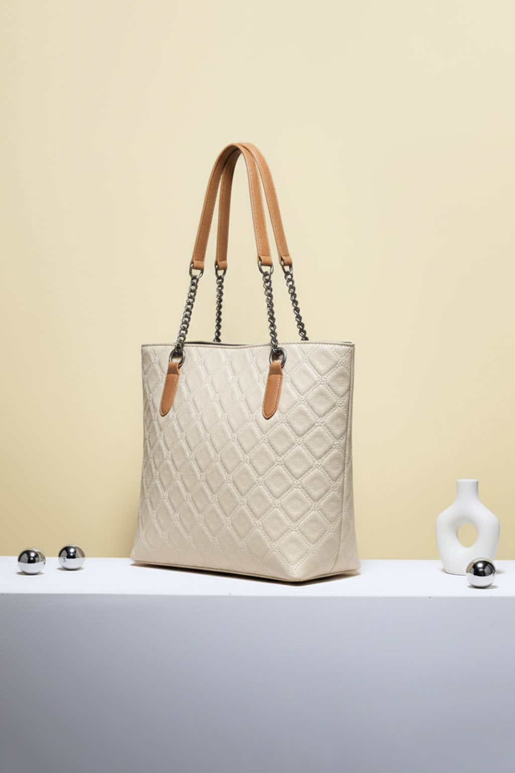 A sophisticated tote bag featuring an elegant quilted diamond pattern, designed to add timeless charm to any outfit. The cream body is paired with sturdy tan handles and chain detailing, striking the perfect balance between classic and modern. Spacious and durable, this tote is ideal for everyday use, whether for work, shopping, or casual outings, offering both style and practicality.