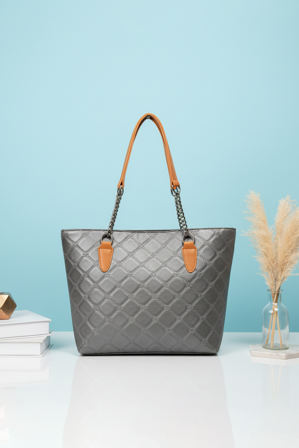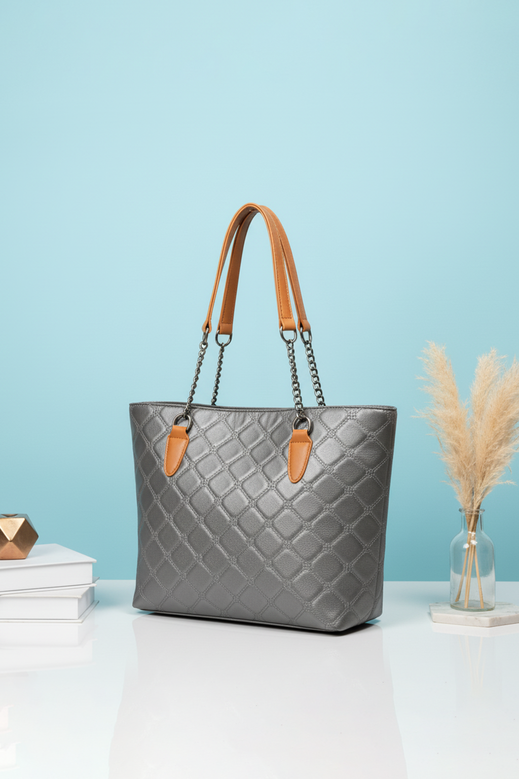 A chic and versatile tote bag featuring a quilted diamond pattern for a touch of elegance. The sleek grey body is complemented by tan handles with chain accents, giving it a refined and modern look. Designed with ample space, this tote is perfect for carrying daily essentials while maintaining a polished style. Ideal for both work and casual outings, it’s the perfect blend of practicality and sophistication.