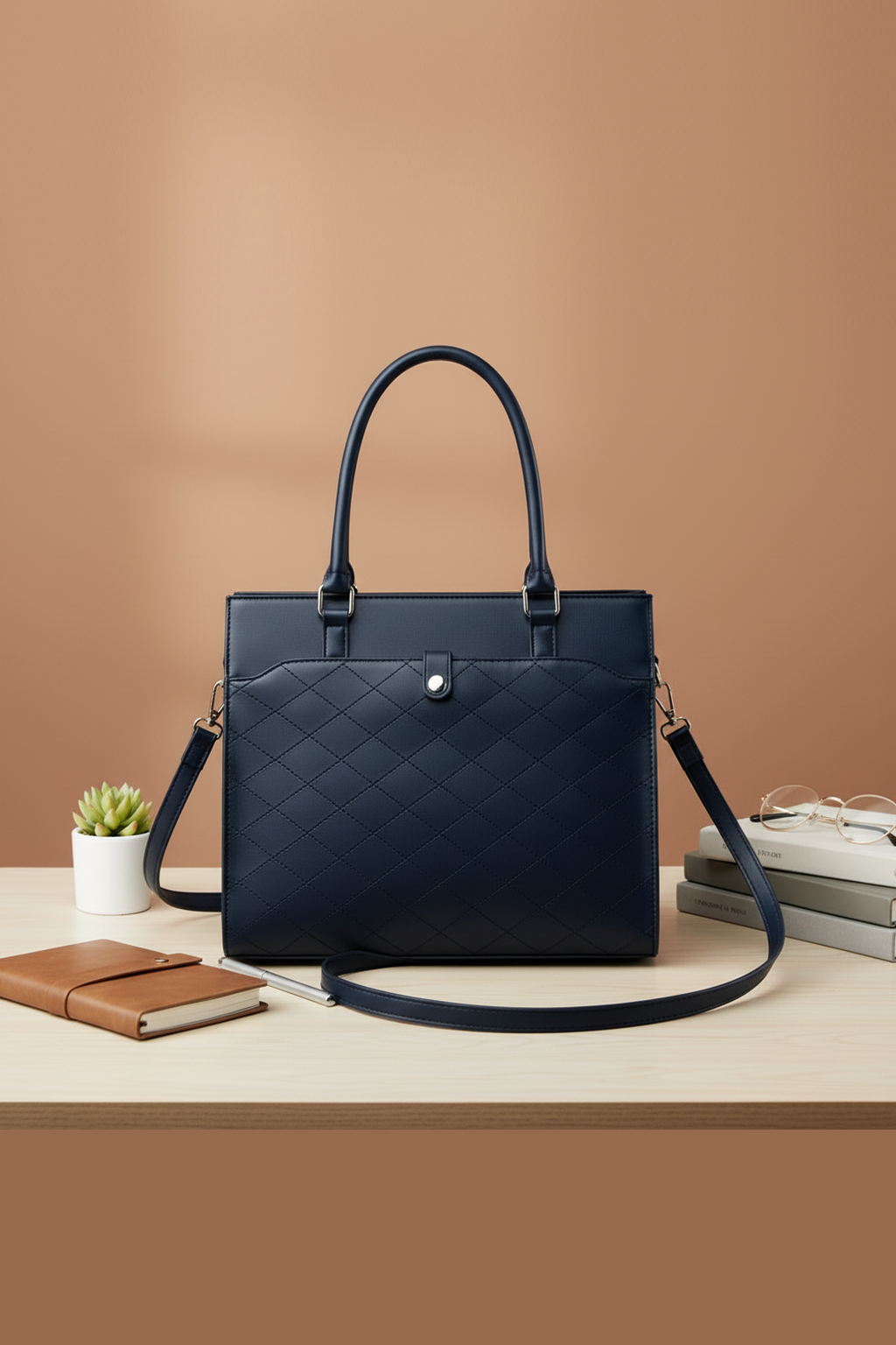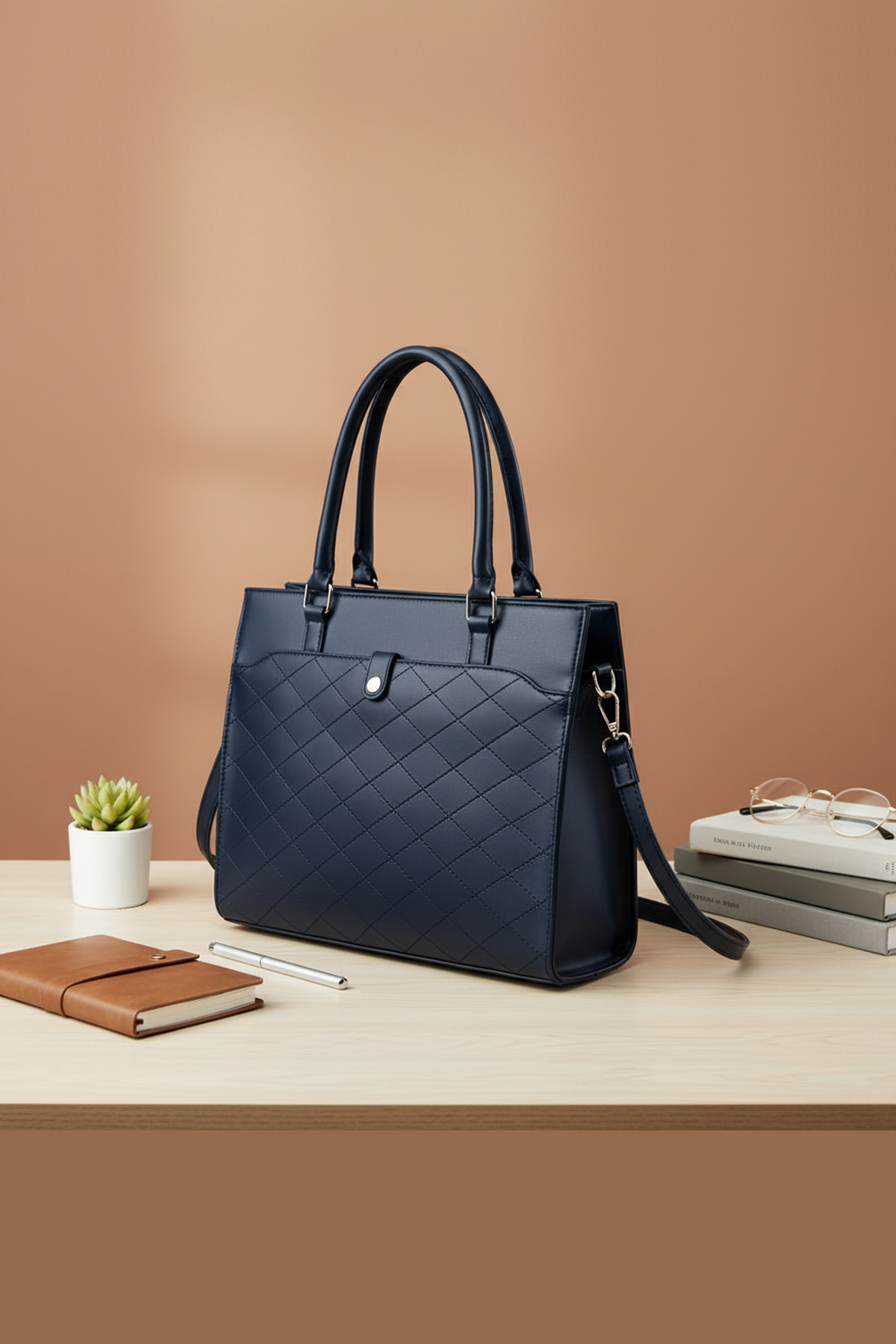 This navy blue quilted tote bag blends timeless elegance with modern utility. Designed with a diamond-quilted front panel, it offers a polished and sophisticated look. Featuring sturdy top handles and a detachable shoulder strap, it can be carried by hand or worn crossbody for versatility. The structured silhouette ensures it holds its shape, while the spacious interior provides ample room for work essentials, books, or daily items. Perfect for office wear or casual outings, this bag is a chic and practical staple.
