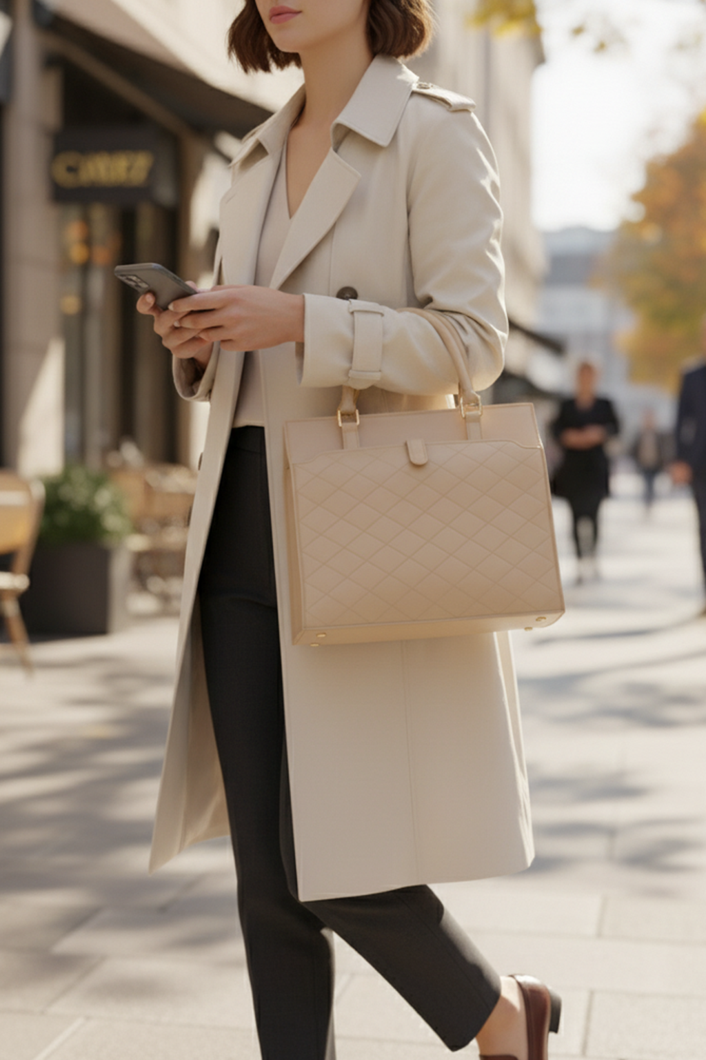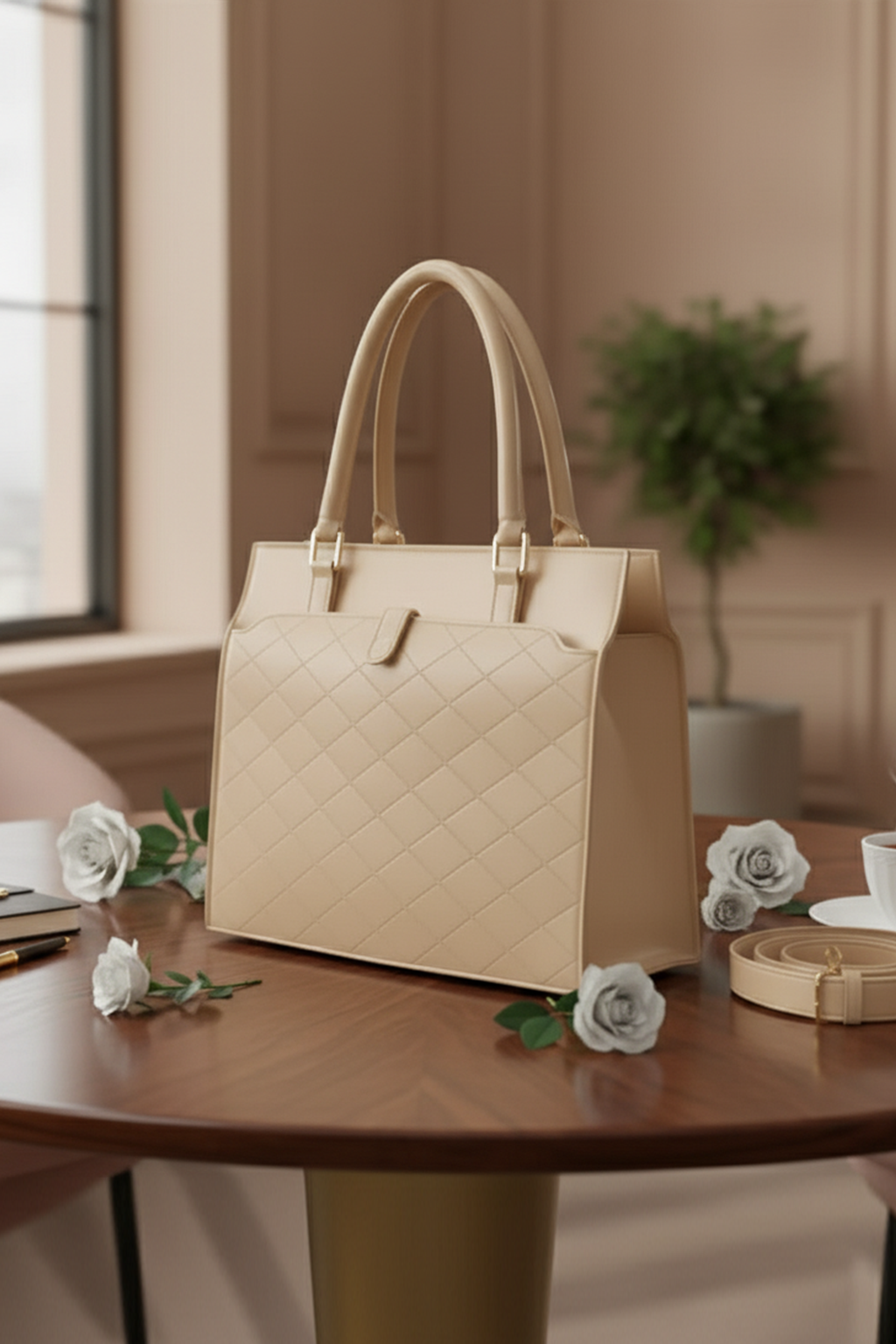 This beige quilted tote bag is the epitome of timeless elegance and functionality. Designed with a structured silhouette, it features a diamond-quilted pattern on the front that adds a touch of sophistication. The sturdy top handles make it easy to carry, while the detachable crossbody strap provides versatile styling options. With ample interior space, this bag is perfect for carrying daily essentials, making it a refined choice for both work and casual outings.