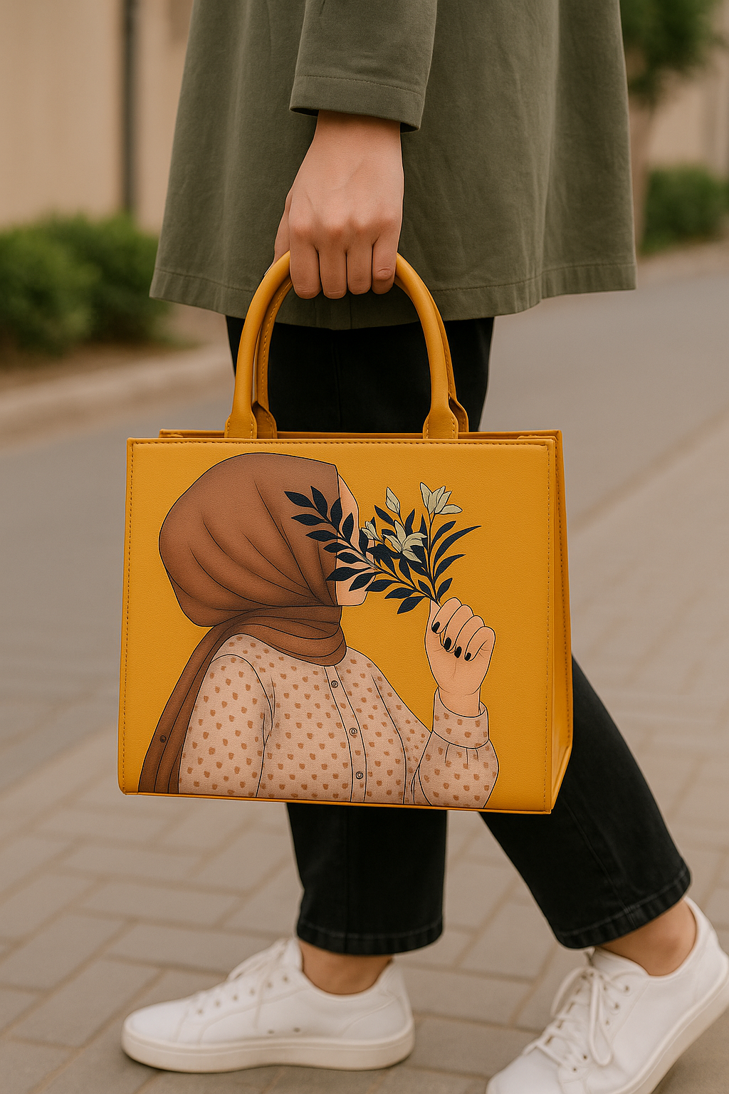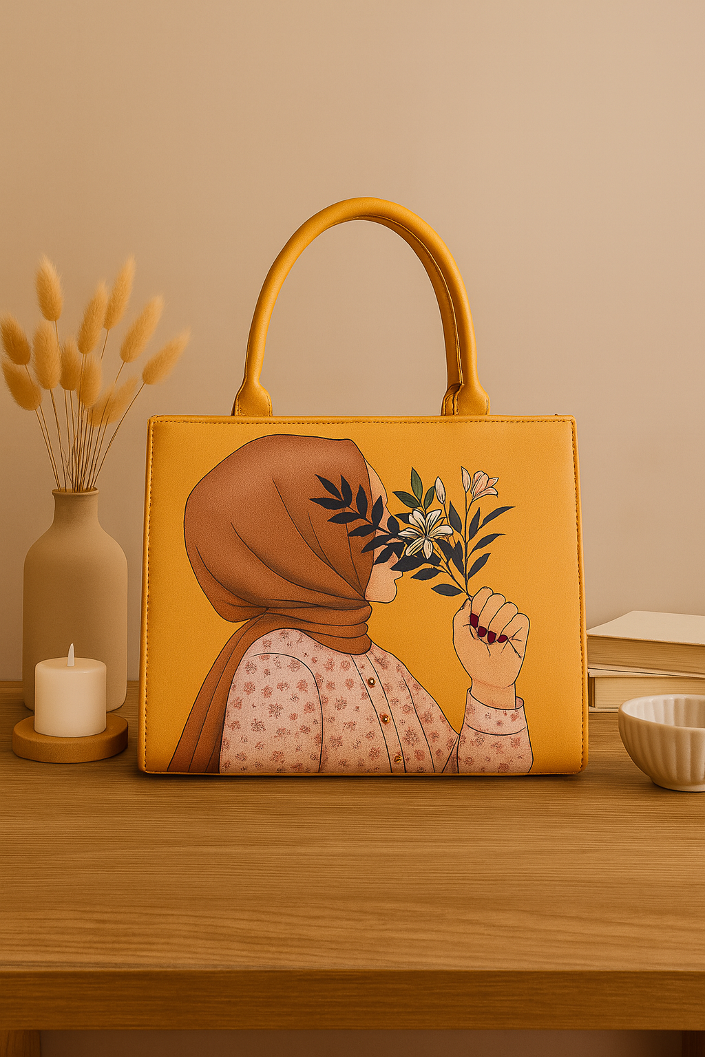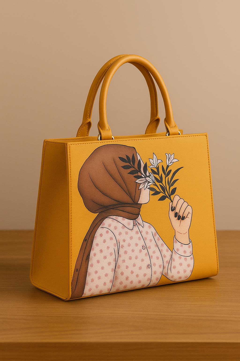 Crafted from premium materials with durable stitching and gold-toned hardware, our bags are built to last while keeping your essentials organized. The structured silhouette offers a timeless look, while the artwork adds a fresh, cultural touch—featuring thoughtful designs like women in hijab, floral elements, and serene scenes that reflect individuality and grace.