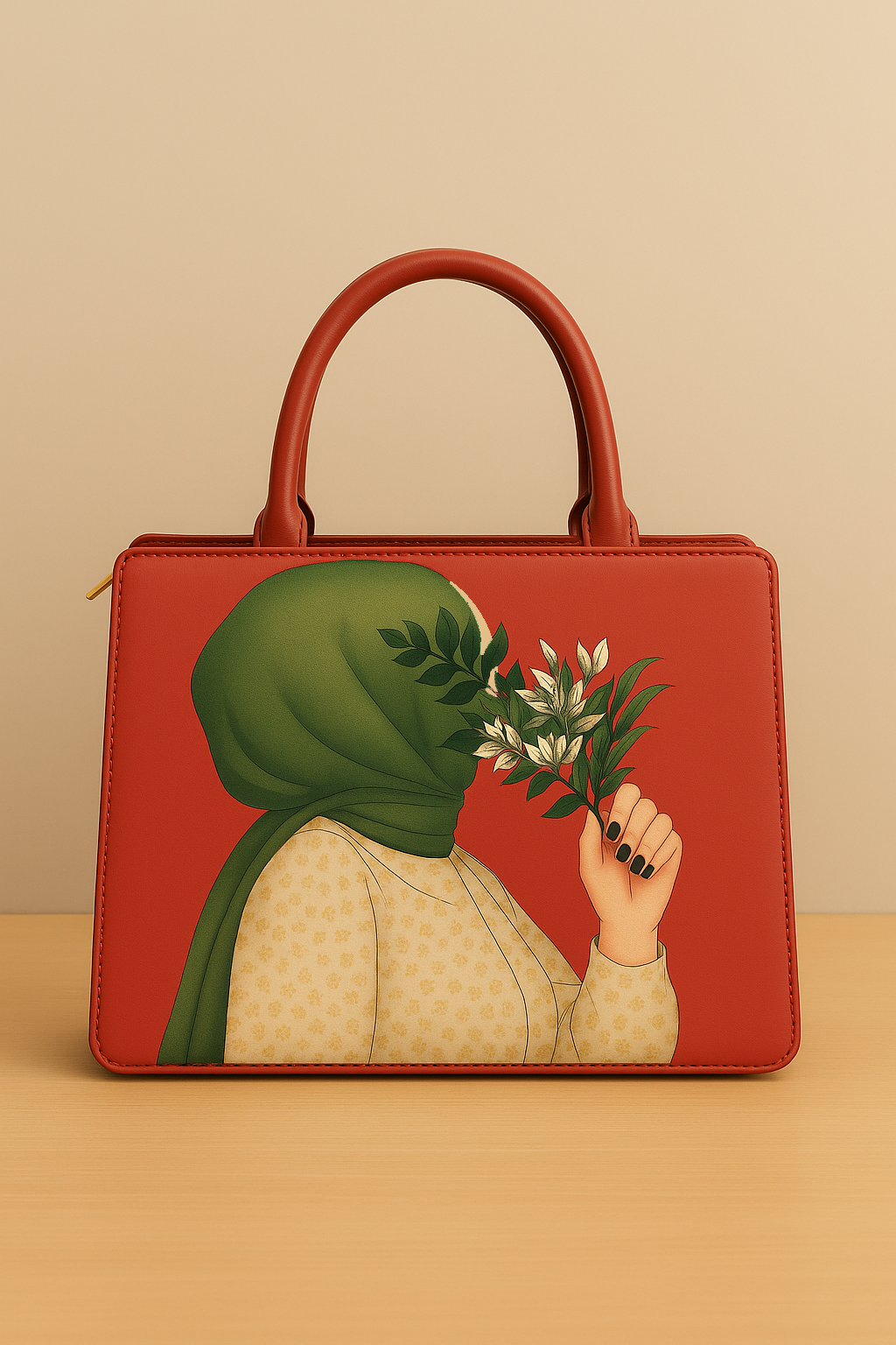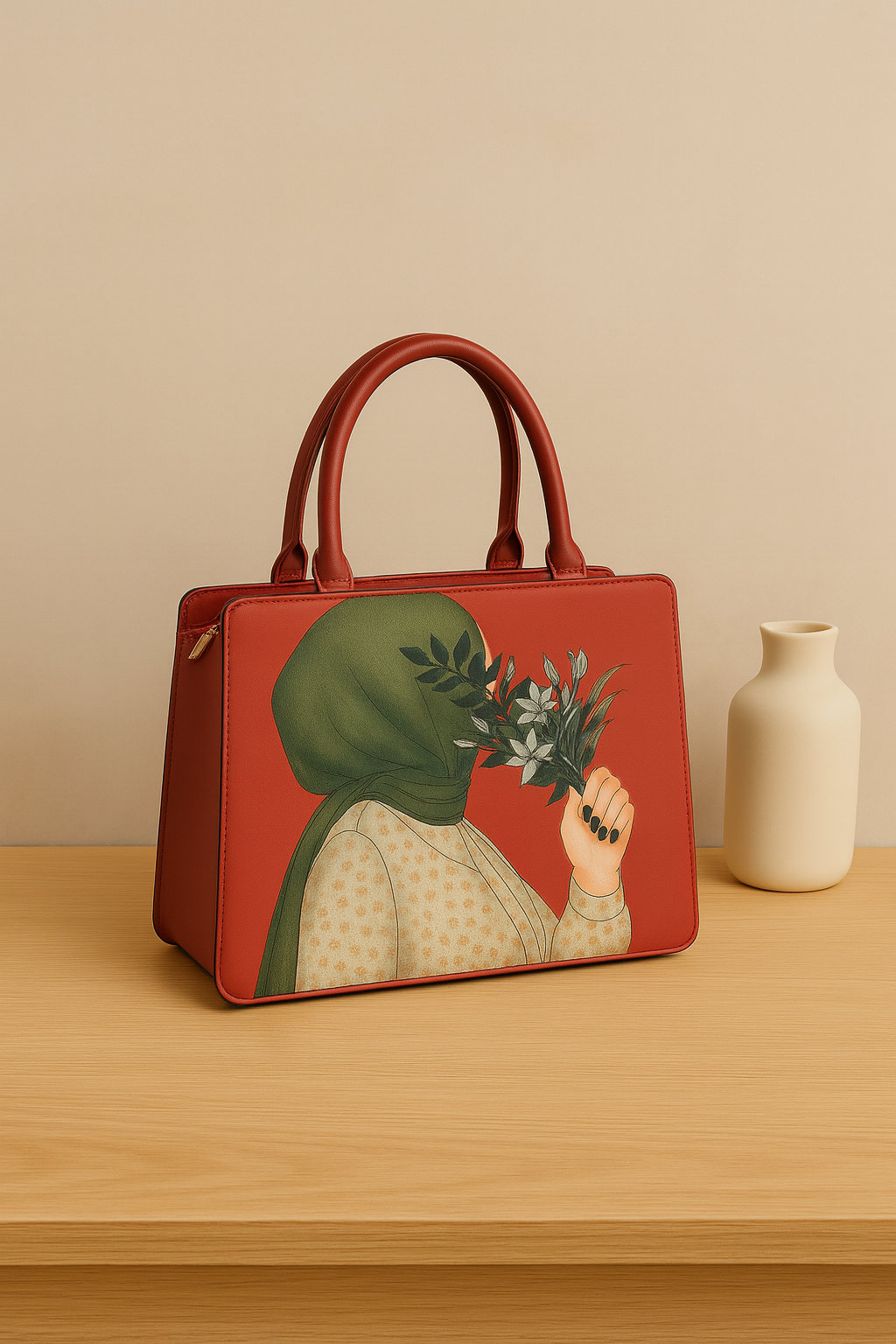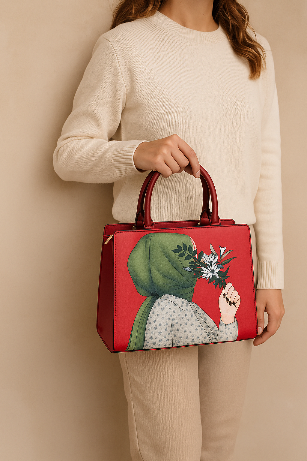 Crafted from premium materials with durable stitching and gold-toned hardware, our bags are built to last while keeping your essentials organized. The structured silhouette offers a timeless look, while the artwork adds a fresh, cultural touch—featuring thoughtful designs like women in hijab, floral elements, and serene scenes that reflect individuality and grace.