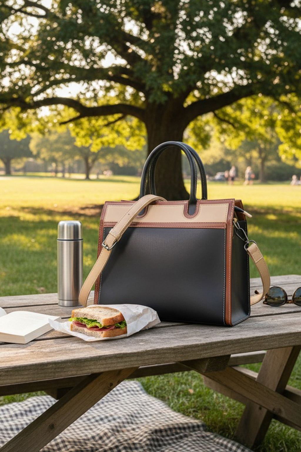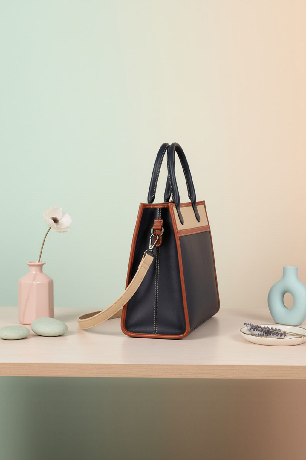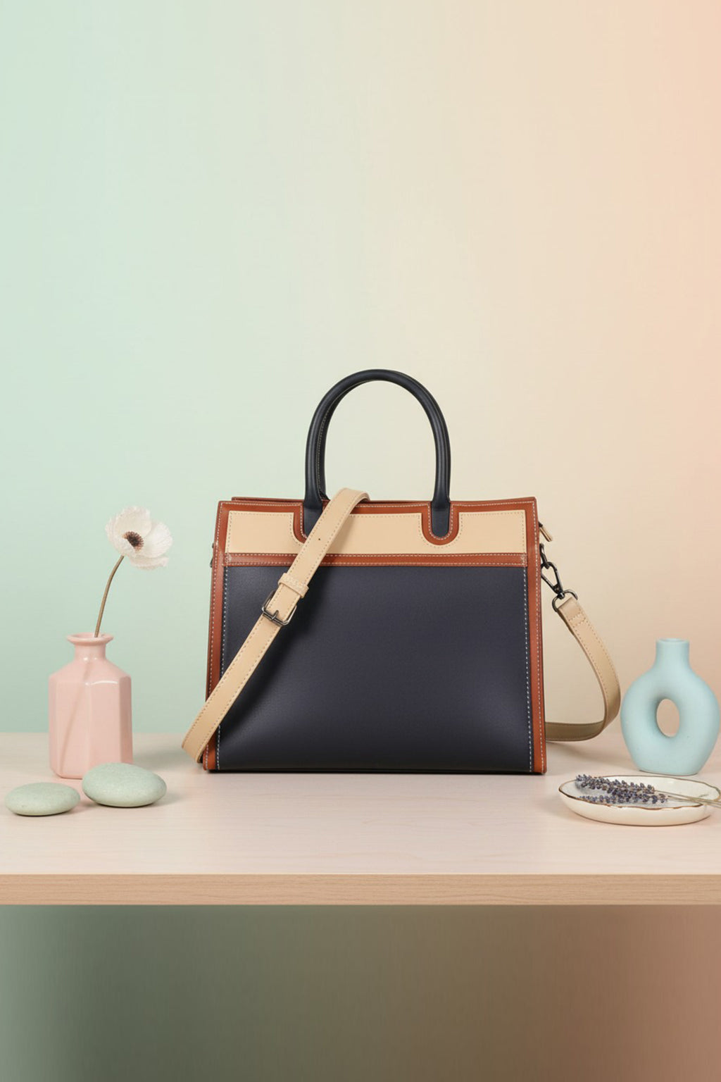 A sophisticated structured handbag designed in a stylish colorblock palette of navy blue, beige, and tan, finished with black top handles. It comes with both sturdy dual handles and a detachable shoulder strap for versatile carrying options. The clean lines and contrast stitching add a polished touch, making it perfect for work, meetings, or everyday chic styling. Spacious and elegant, this handbag balances functionality with timeless design.