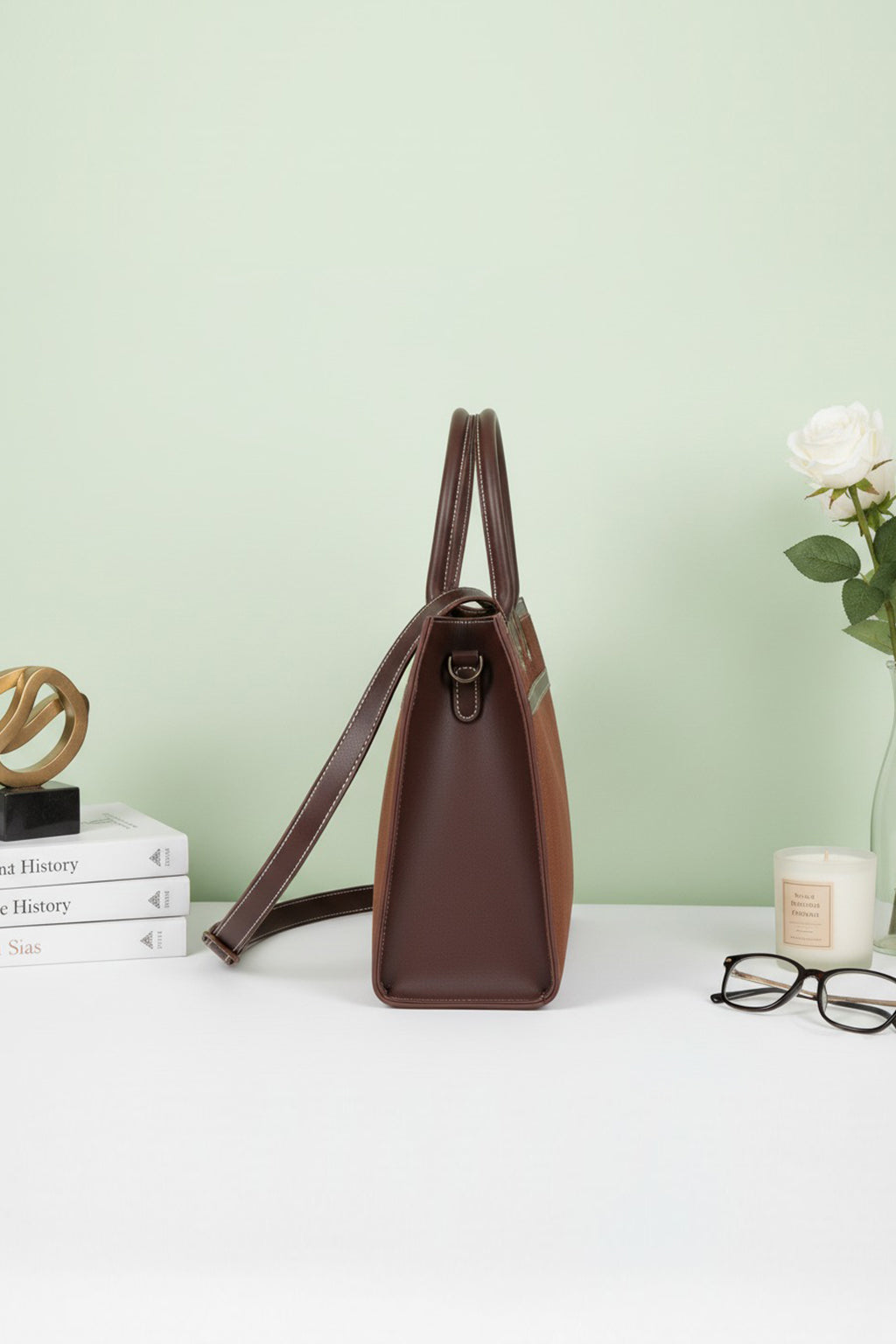 This elegant tote bag features a rich coffee brown body accented with dark chocolate leather trim and contrast stitching for a polished look. Designed with a structured silhouette, it includes sturdy top handles and an adjustable detachable shoulder strap for versatile styling. The spacious interior makes it perfect for work, business meetings, or everyday use, while the refined finish ensures a timeless and professional appeal.