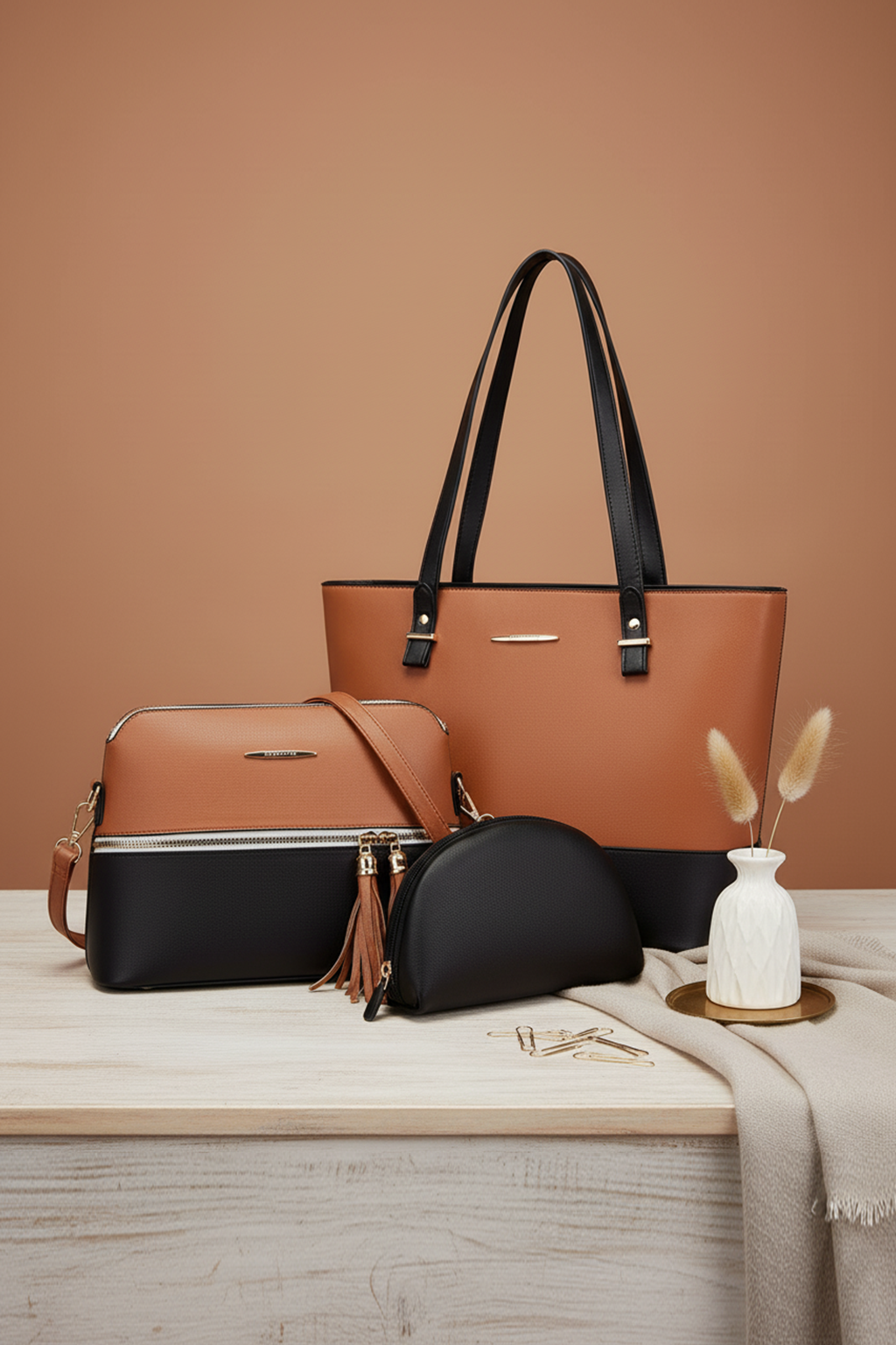 This fashionable 3-piece handbag set is designed to complement both casual and formal looks. It includes a roomy tote bag with sturdy double handles, a crossbody bag with an adjustable strap, and a small pouch for essentials. Crafted from high-quality faux leather, the bags feature a chic tan brown and black color combination with gold-tone hardware. The crossbody bag is adorned with tassel zipper pulls for a stylish touch. Perfect for work, shopping, travel, or daily use, this versatile set offers both elegance and functionality.