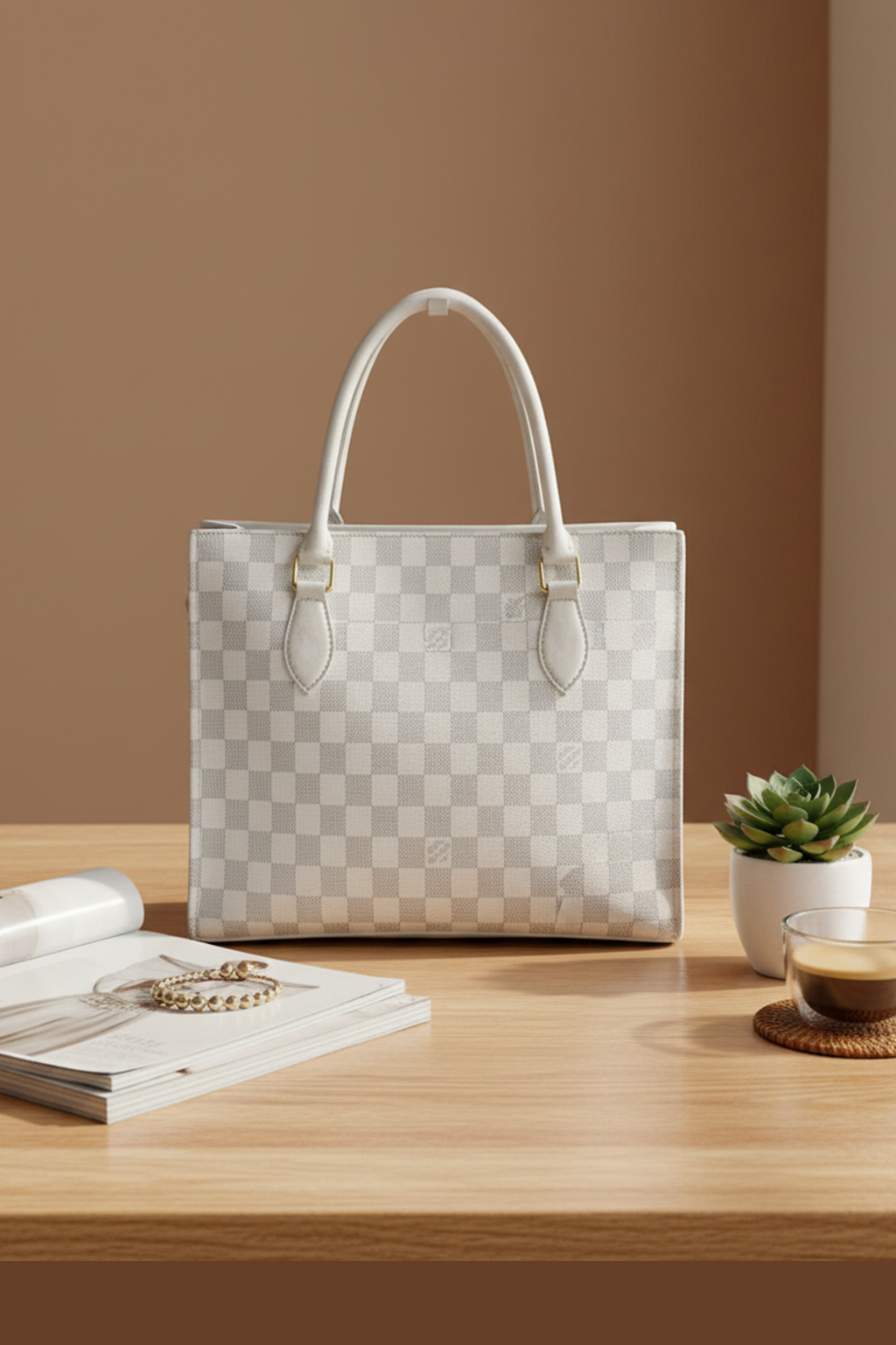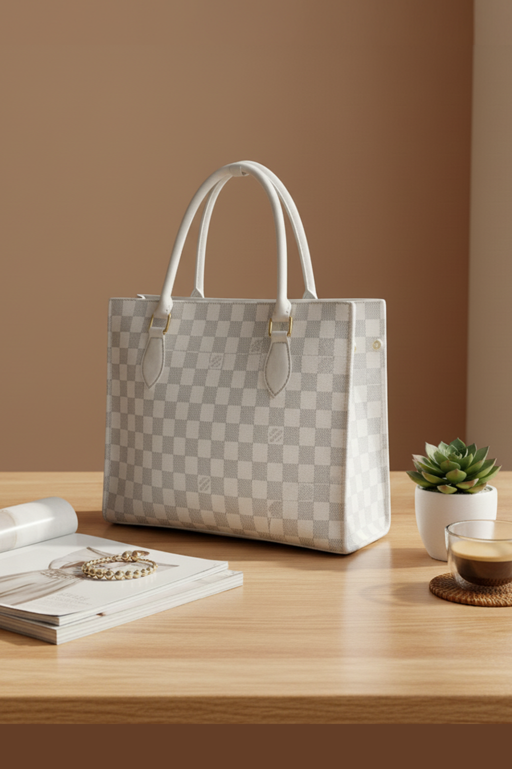 White Kaeluxe Checkered Signature Tote